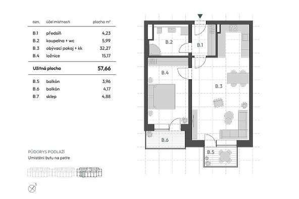 Ke komfortu bydlení přispívají také 2 balkony o rozloze 3,96 m² a 4,88 m² sklepní kóje 4,17 m², která je součástí kupní ceny.