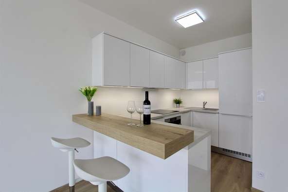 Obývací pokoj s kuchyňským koutem (25 m2) je vybaven linkou na míru s vestavnými spotřebiči značky Siemens a AEG (indukční varná deska, elektrická trouba s funkcí mikrovlnné trouby, digestoří ovládanou pohybem ruky, myčkou a lednicí s mrazákem).