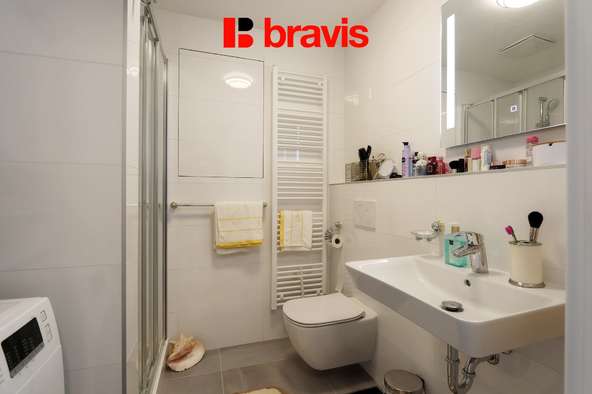 Koupelna je vybavena je sprchovým koutem, umyvadlem, pračkou a toaletou.