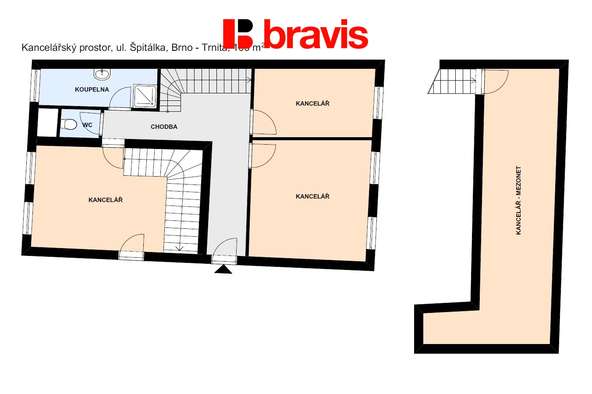 Celé prostory jsou ve spodním patře rozděleny na několika místností a v horním mezonetovém patře je jedna kancelář, kterou lze využít jako služební byt pro přespání.