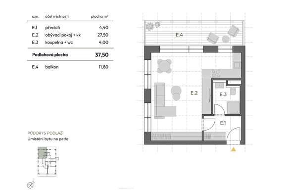 PROMYŠLENÁ DISPOZICE bytu o dispozici 1+kk (2E) o celkové ploše 37,5m²:
