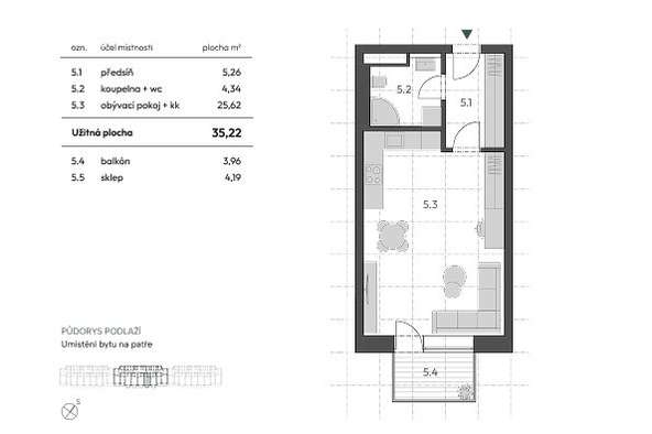 Nabízíme Vám byt 1+kk o užitné ploše 35 m² s balkonem ve 2. nadzemním podlaží. Tento byt (označení B.2E) je ideální volbou pro jednotlivce, páry i zájemce o investiční nemovitost pro pronájem.