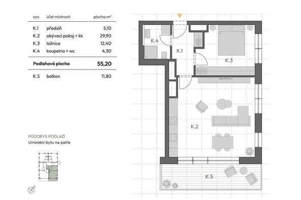 PROMYŠLENÁ DISPOZICE bytu o dispozici 2KK (3K) o celkové ploše 55,2m²: