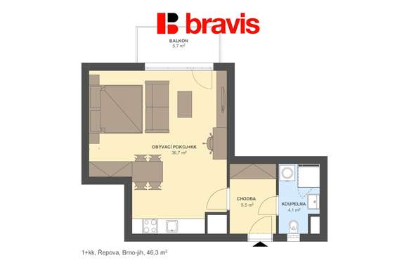 Dispozice 1+kk má praktické a moderní uspořádání, které nabízí dostatek prostoru pro pohodlný život.