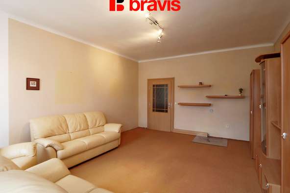 V obývací části je kožená sedací souprava a šatní skříň, je možné nábytek vyklidit. Orientace obývacího pokoje je na východní stranu.