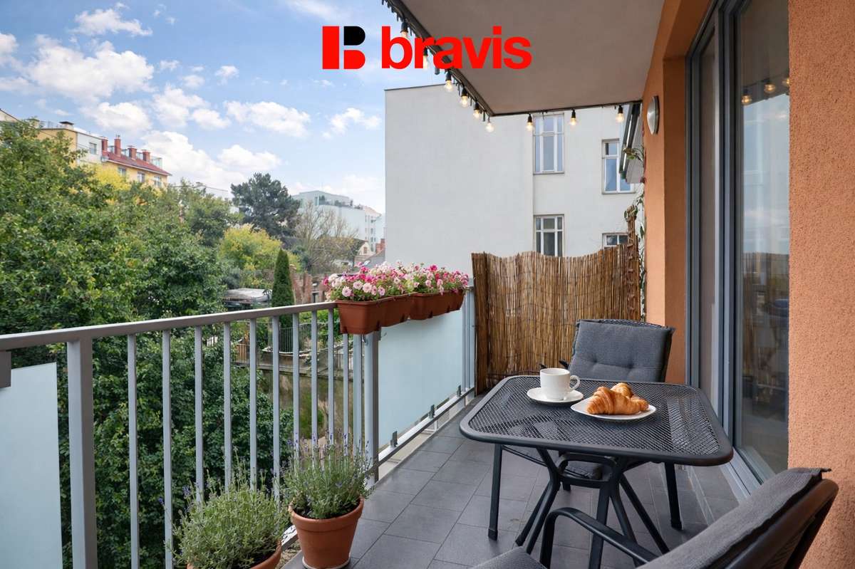 Na balkoně je venkovní nábytek (stůl a 2 židle).