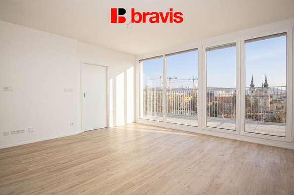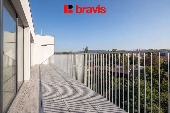 Byt je umístěn v 7. nadzemním podlaží novostavby s výtahem a díky velkým proskleným plochám působí velmi světlým a vzdušným dojmem.