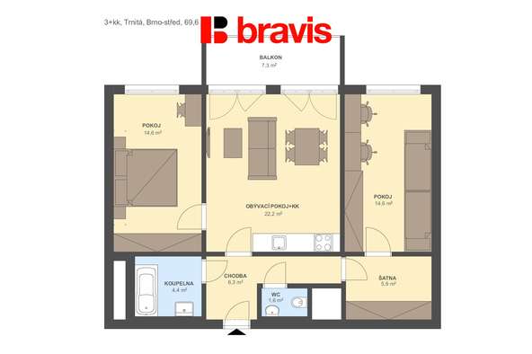 Dominantou bytu je prostorný obývací pokoj s kuchyňským koutem a vstupem na balkon o velikosti 7 m².