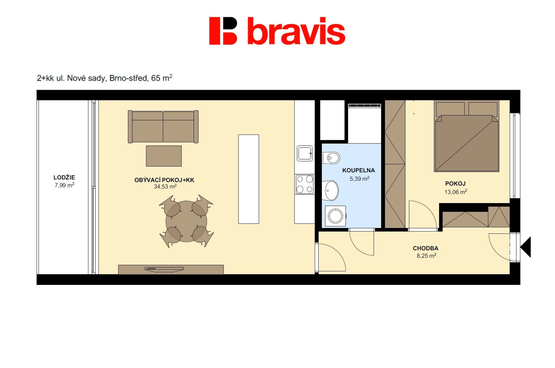 The 2+kk apartment with a total floor area of 62 m2 + loggia of 8 m2 and a cellar is located on the 5th floor.