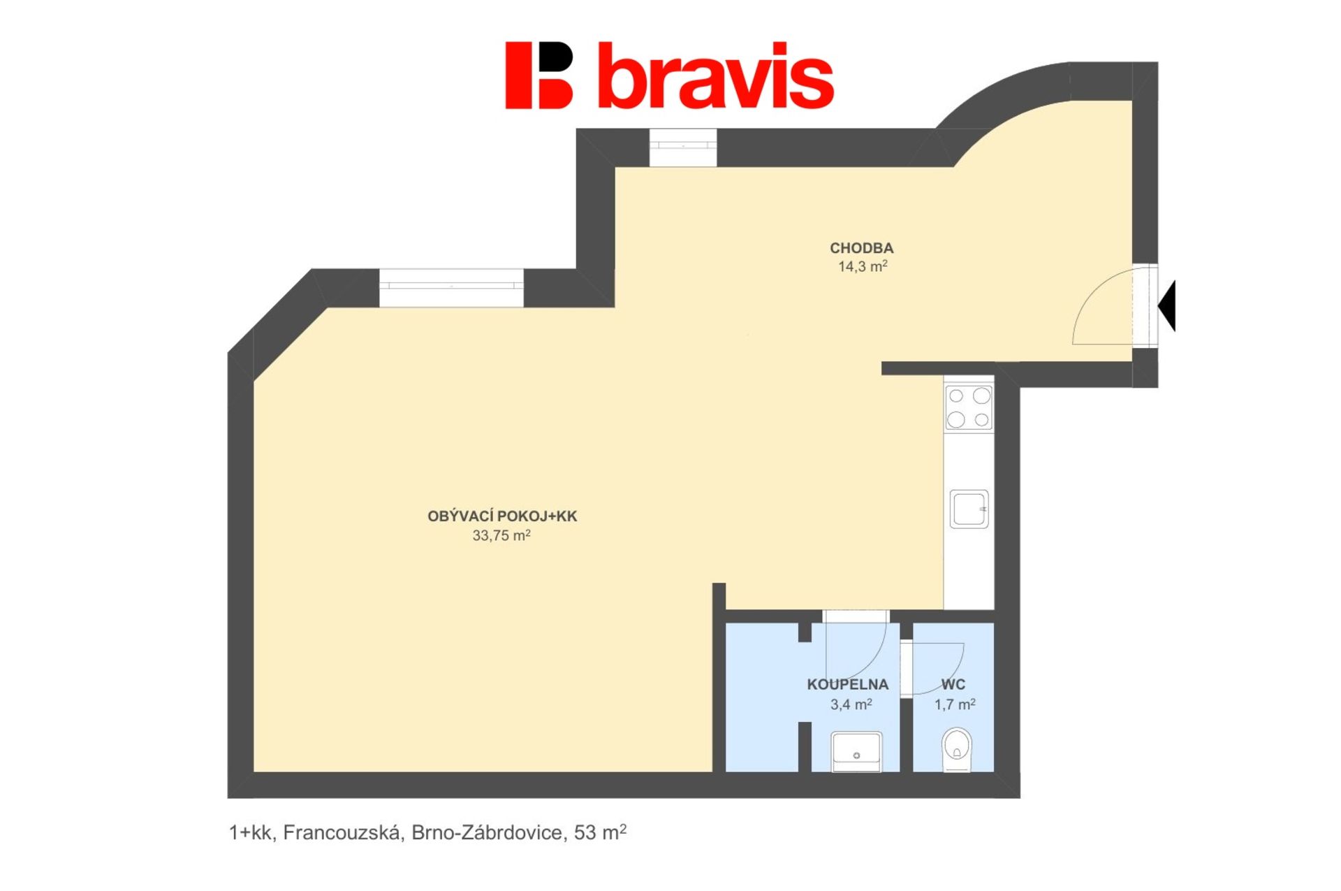 As the exclusive representative of the owner, we offer for rent a 1+kk apartment in Brno - Zábrdovice, on Francouzská Street. The apartment is located on the 5th floor of an apartment building with an elevator and has a total area of 53 m².