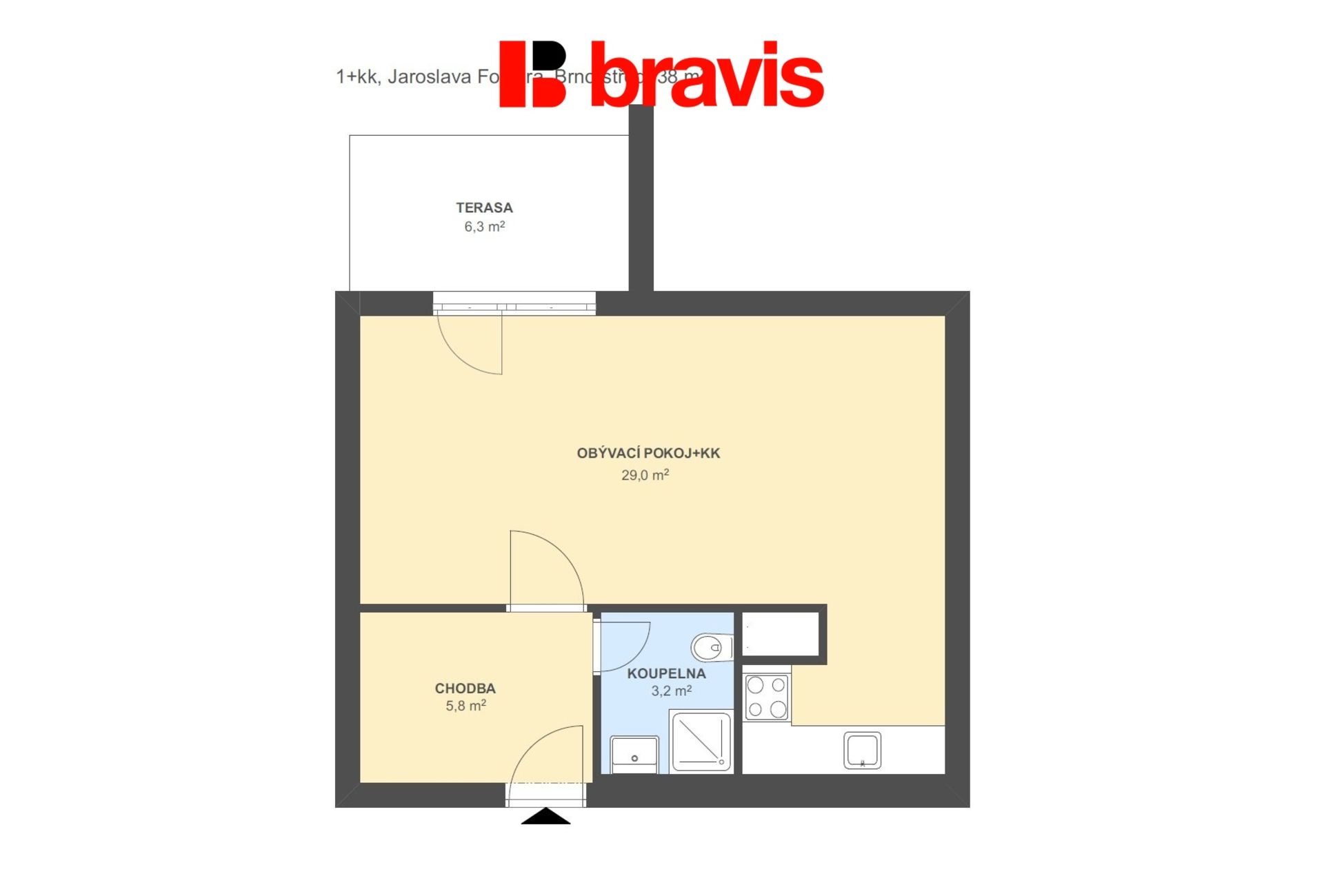 As the exclusive representative of the owner, we offer you for long-term rent a beautiful apartment with a 1+kk layout and a total usable area of 44 m2 (38 m2 apartment + 6 m2 glazed terrace), located on the 1st floor of a brick house with an elevator on Jaroslava Foglara Street.