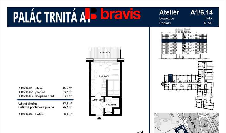 Apartment for rent, 1+kk, Palác Trnitá, ul. Placzkova, new building, garage, cellar