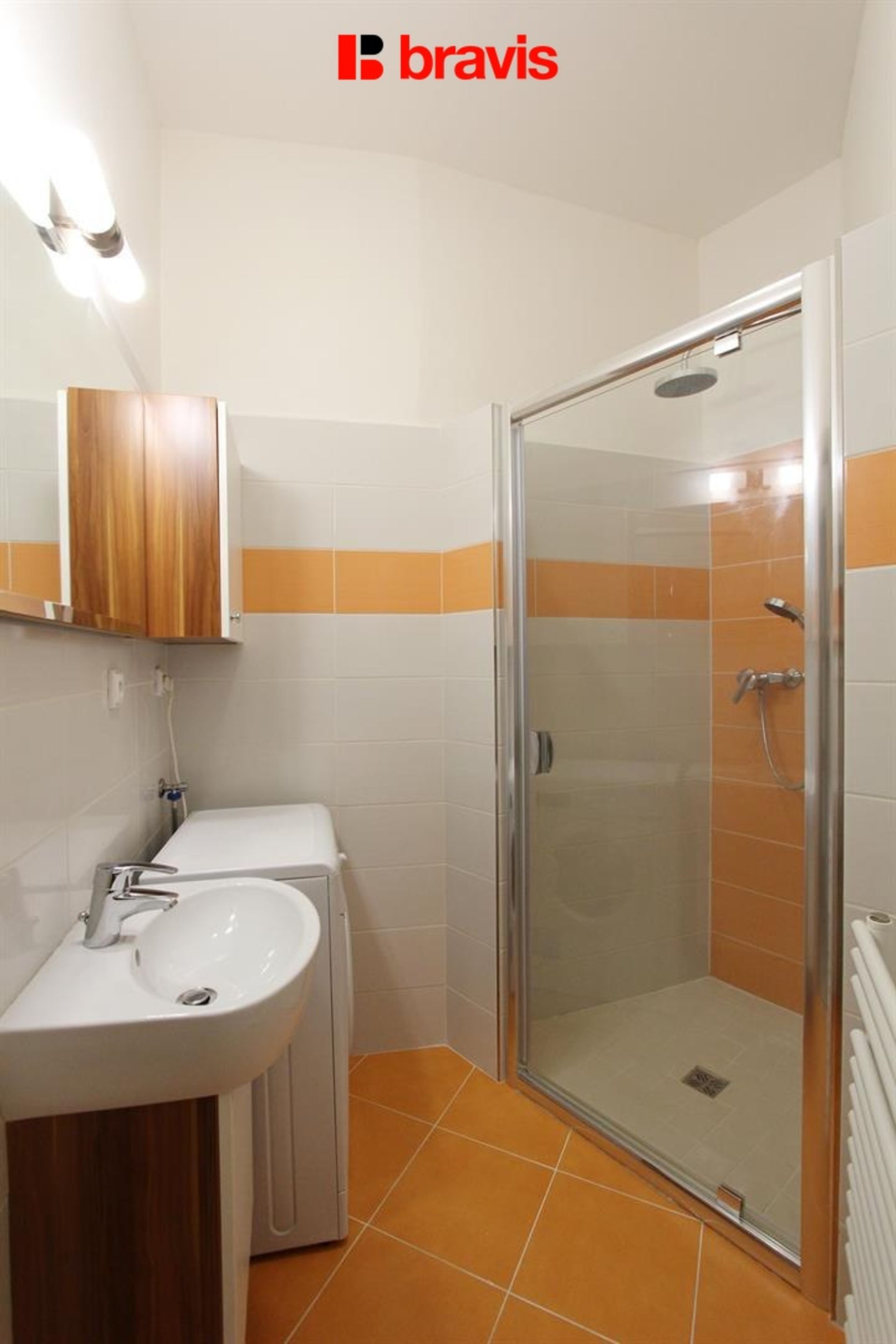 The bathroom is equipped with a shower, washing machine, sink, cabinet with storage space, mirror and heating ladder. The toilet is separate, which increases the comfort of living.