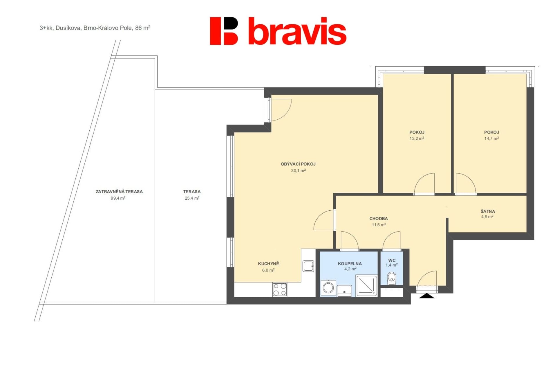 Apartment for rent 3+kk, Dusíkova street, Brno - Lesná, 86 m2, terrace, garden, parking, cellar,