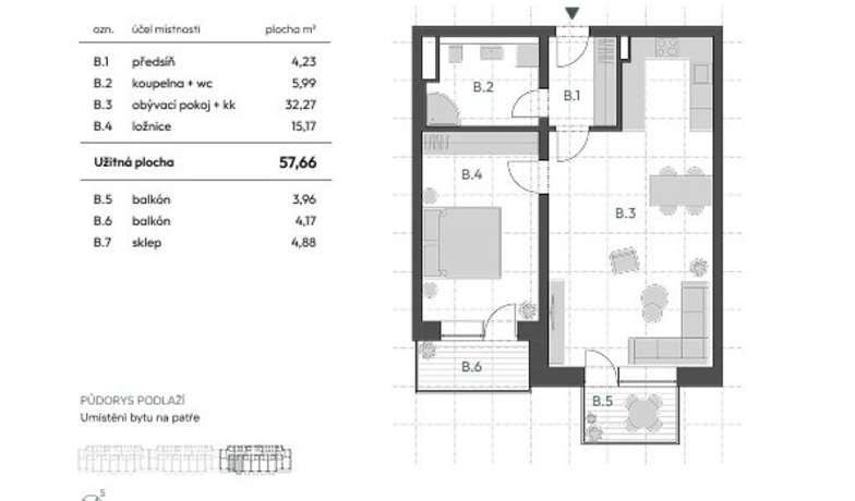 We offer for sale a modern apartment marked C.2B with a 2+kk layout and a usable area of 57.66 m² in the new development project Rezidence Haná in Vyškov. Rezidence Haná brings modern and comfortable living in an attractive location of Vyškov.