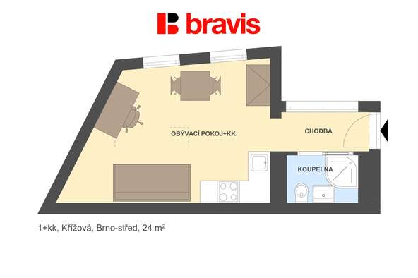 On the exclusive representation of the owner, we offer for rent a 1+kk apartment on Křížová Street, Brno - Střed. The apartment with an area of 24 m2 is located on the 2nd floor of an apartment building in a quiet courtyard near Mendlova Square.