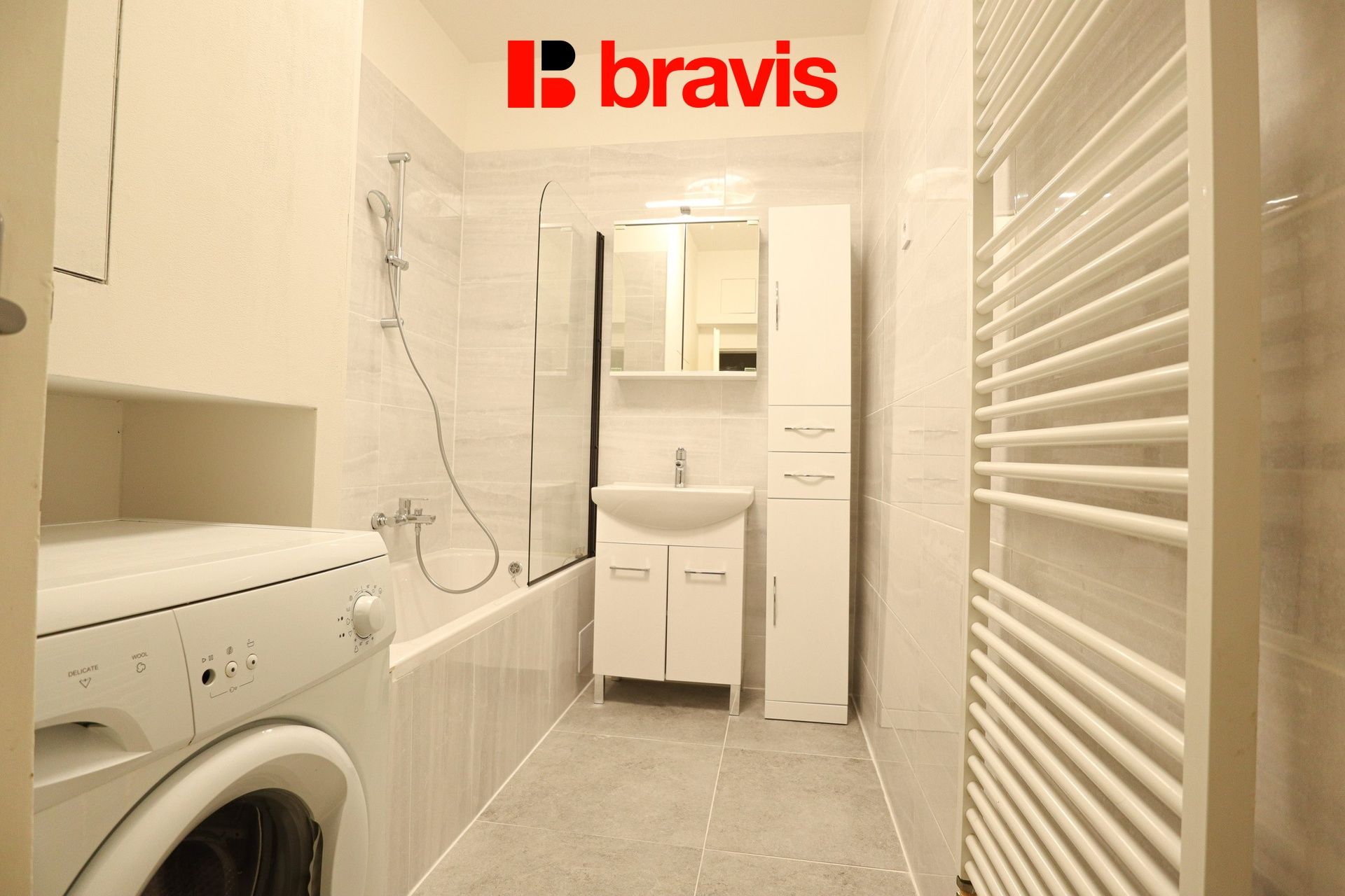 V koupelně, která letos prošla rekonstrukcí, je vana, umyvadlo, žebříkové topení a pračka.