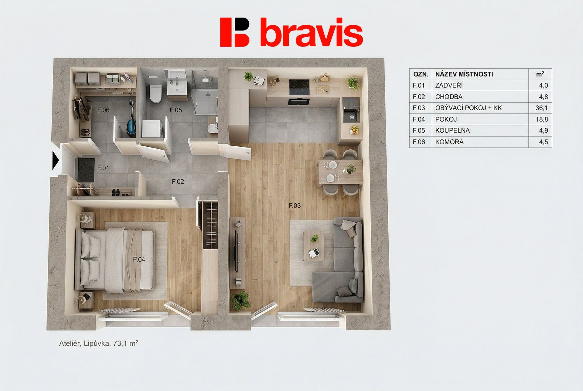Přesně takové možnosti nabízí prostor tohoto krásného ateliéru v právě dokončovaném polyfunkčním komplexu Lipůvka! Ateliér nabízí velkorysý obývací pokoj s kuchyňským koutem o vel. 36,1m2, pokoj (18,8m2), komoru/šatnu (4,5m2), chodbu, dostatečně prostornou na uložení věcí a koupelnu s toaletou (4,9).