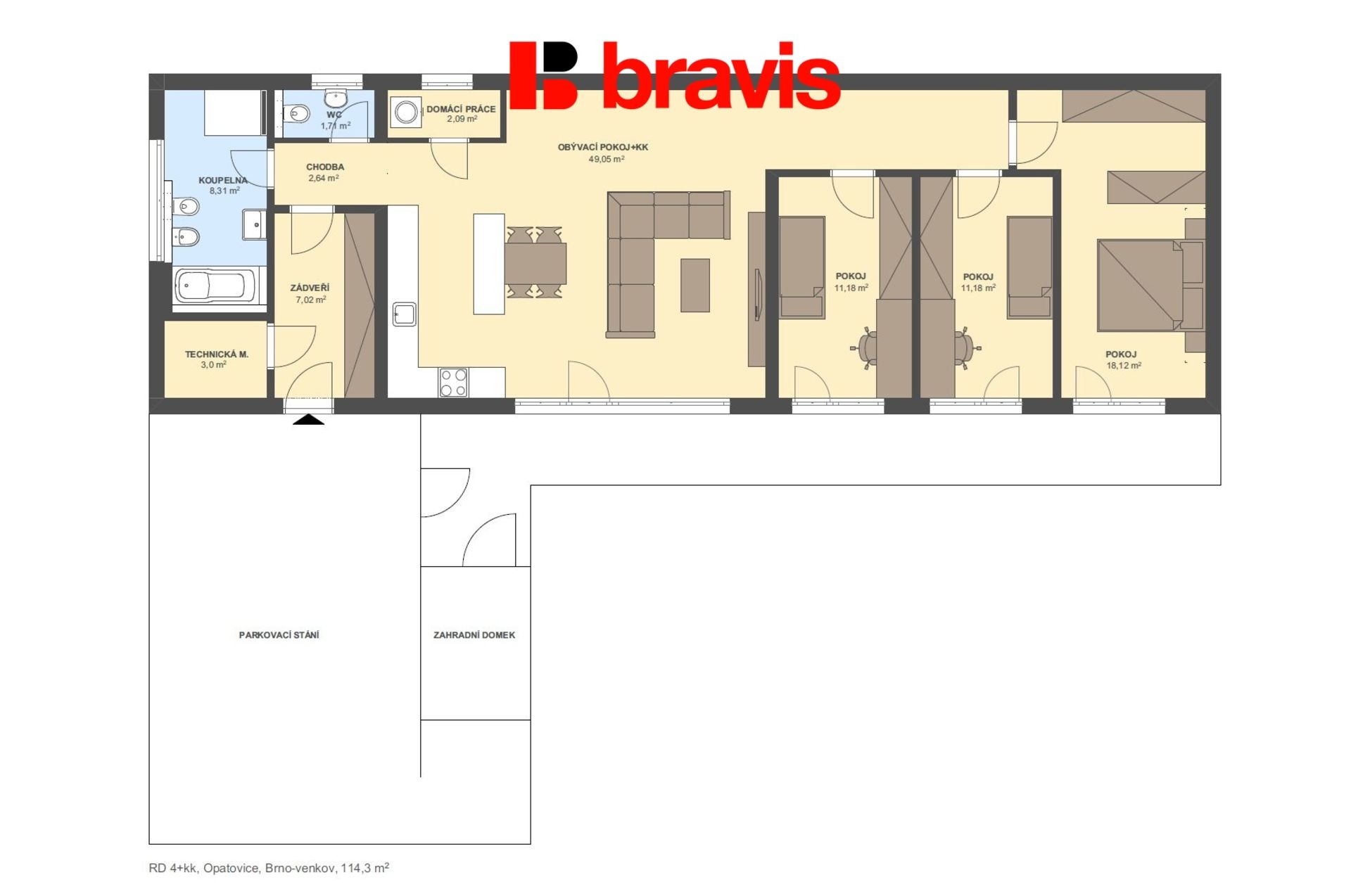 Mimo hlavní obytnou část dům nabízí tři samostatné pokoje (18 m2, 11 m2 a 11 m2), které lze využít jako ložnici, dětské pokoje nebo pracovnu dle vašich potřeb.