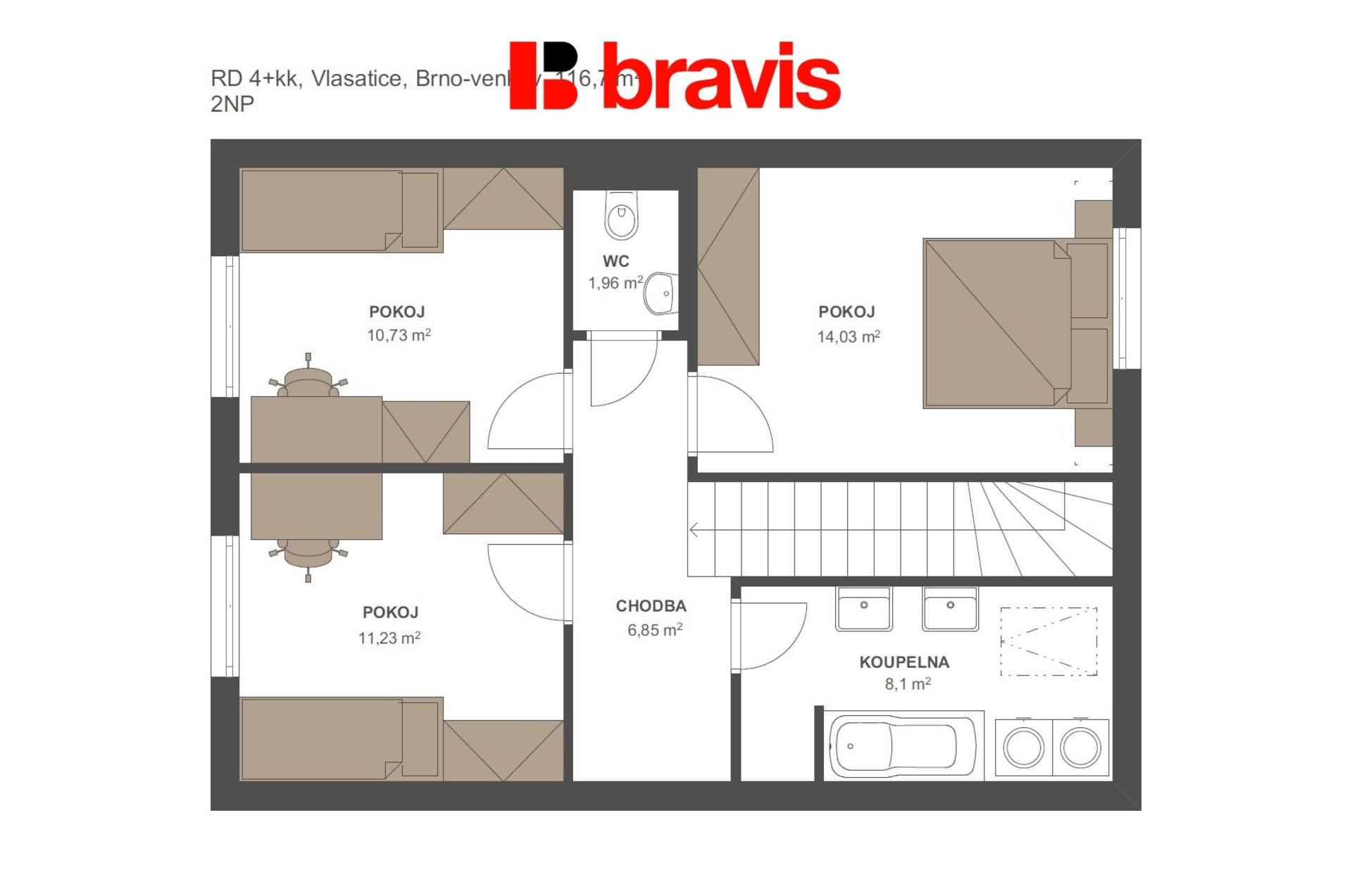 Moderní rodinný dům nabízí dispozici 4+kk s celkovou plochou 117 m2, zahrádku a parkování.
