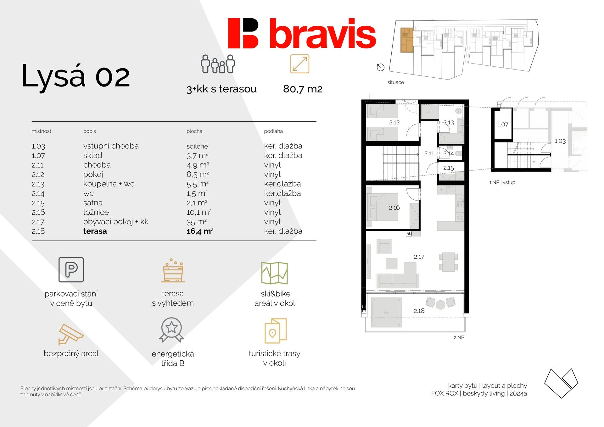 The apartment has a 3+kk layout and a total floor area of 80.7 m². The apartment also includes a spacious terrace of 16.4 m², which offers an ideal space for relaxation, sitting and pleasant spending of free time in the fresh air with a view of the surrounding nature.