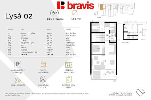 The apartment has a 3+kk layout and a total floor area of 80.7 m². The apartment also includes a spacious terrace of 16.4 m², which offers an ideal space for relaxation, sitting and pleasant spending of free time in the fresh air with a view of the surrounding nature.