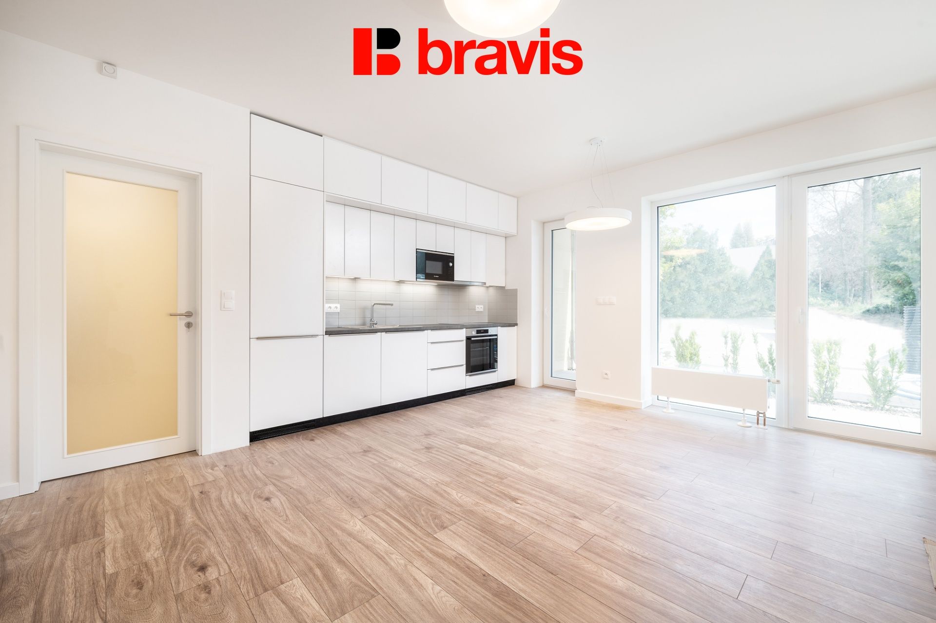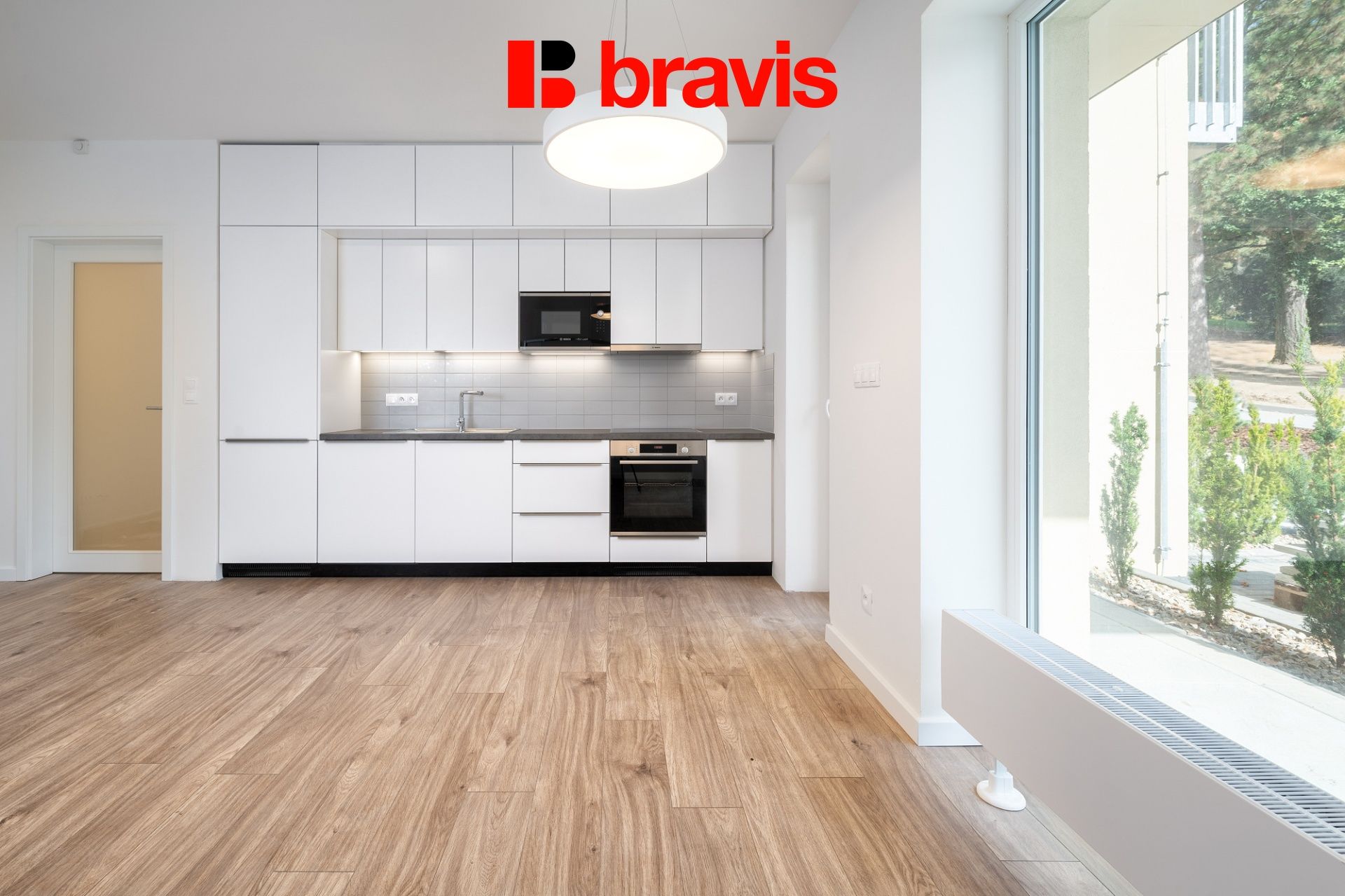 Kuchyně je zařízena kuchyňskou linkou na míru s vestavěnými spotřebiči zn. BOSCH (kombinovaná lednice s mrazícím boxem, myčka, el. trouba, varná deska, digestoř).