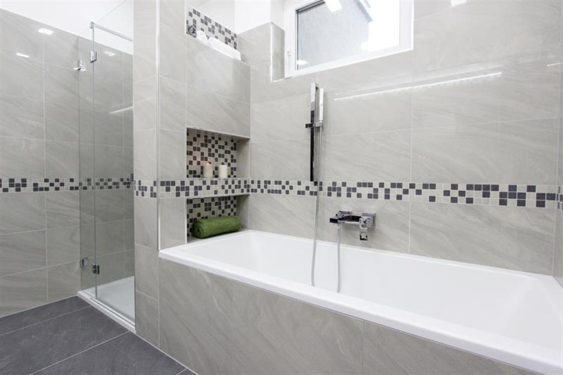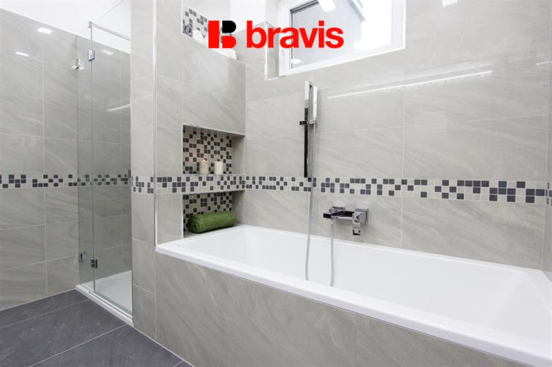 V celém bytě je dlažba s dekorem mramoru, topení podlahové.