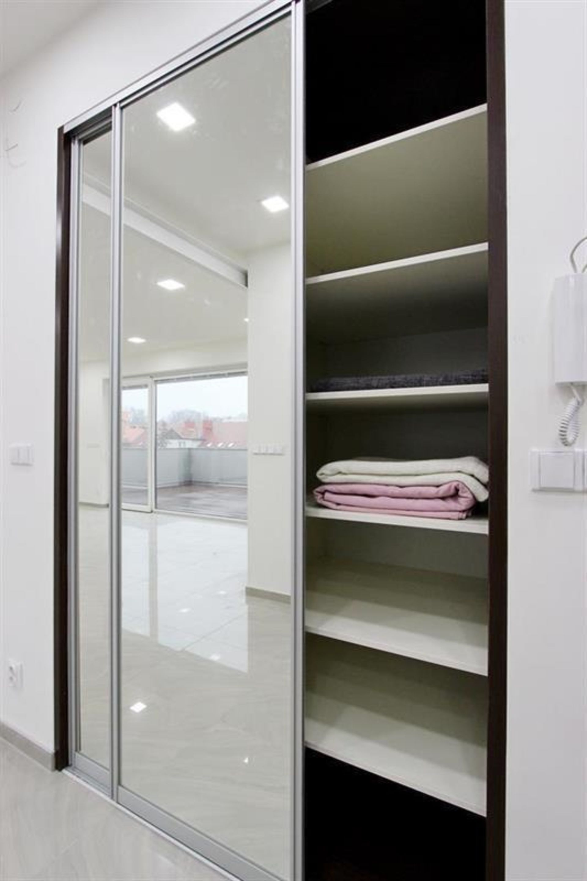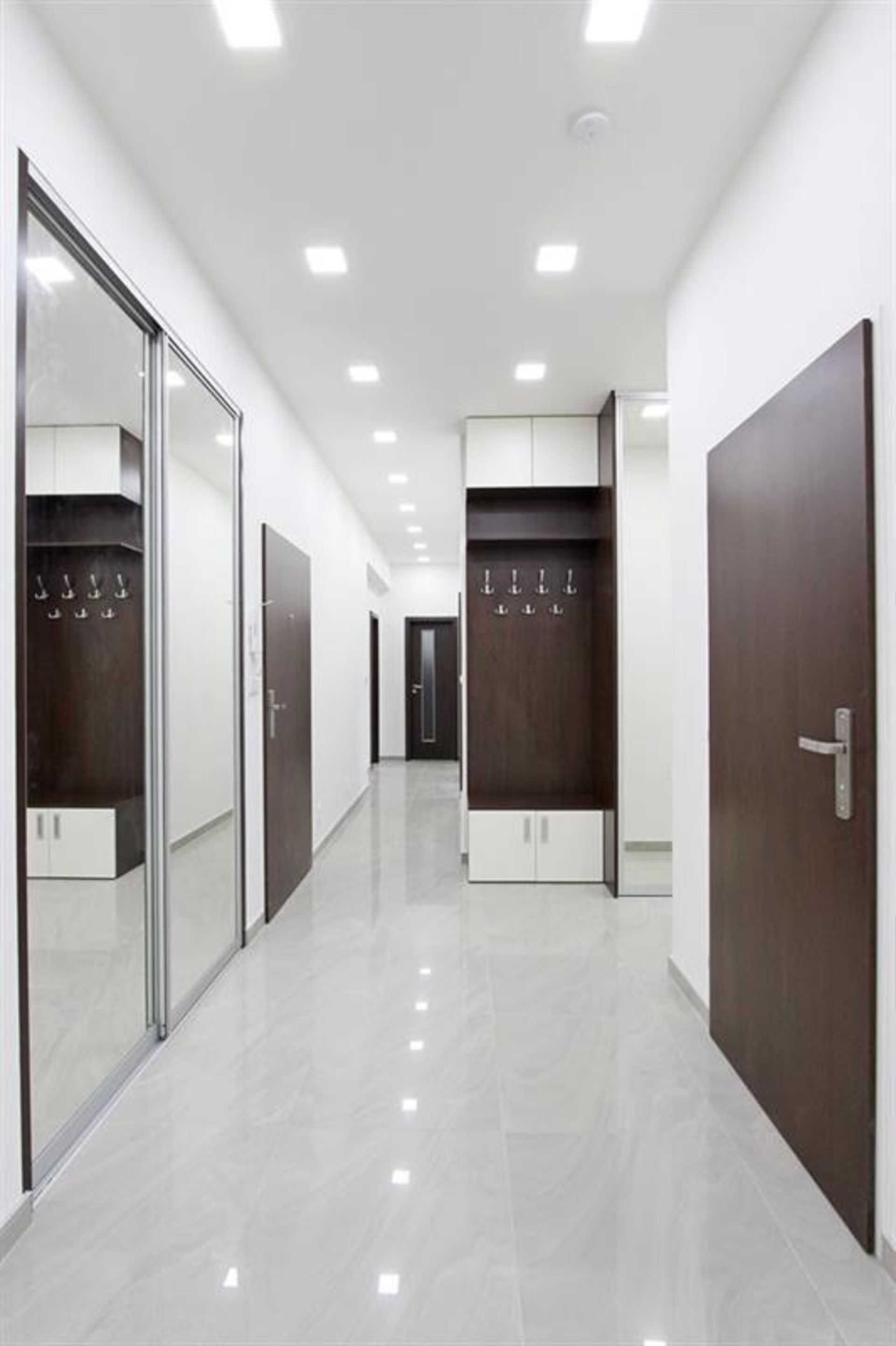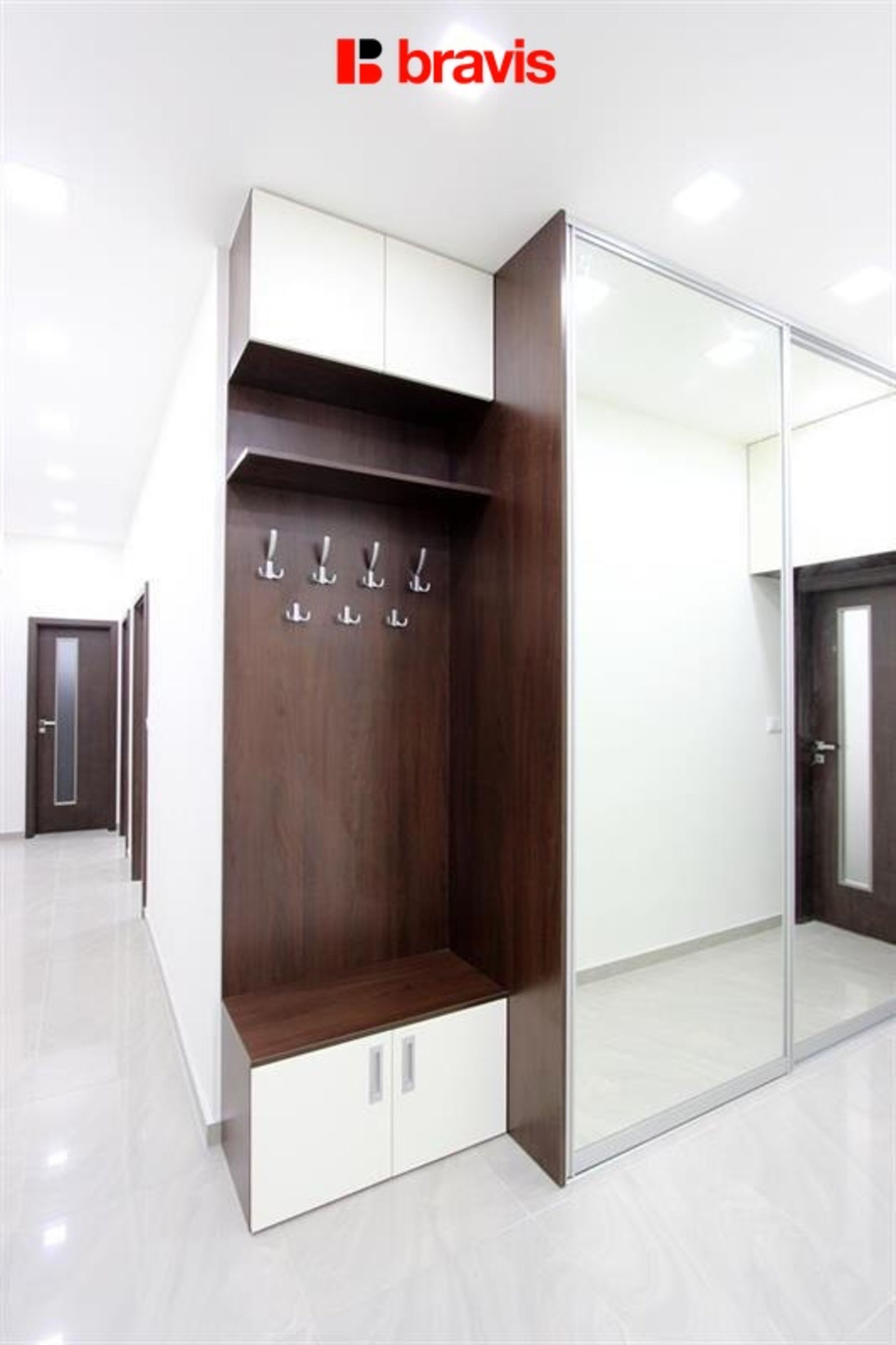 Dvě prostorné zrcadlové skříně v chodbě bytu, botník, šatní stěna.