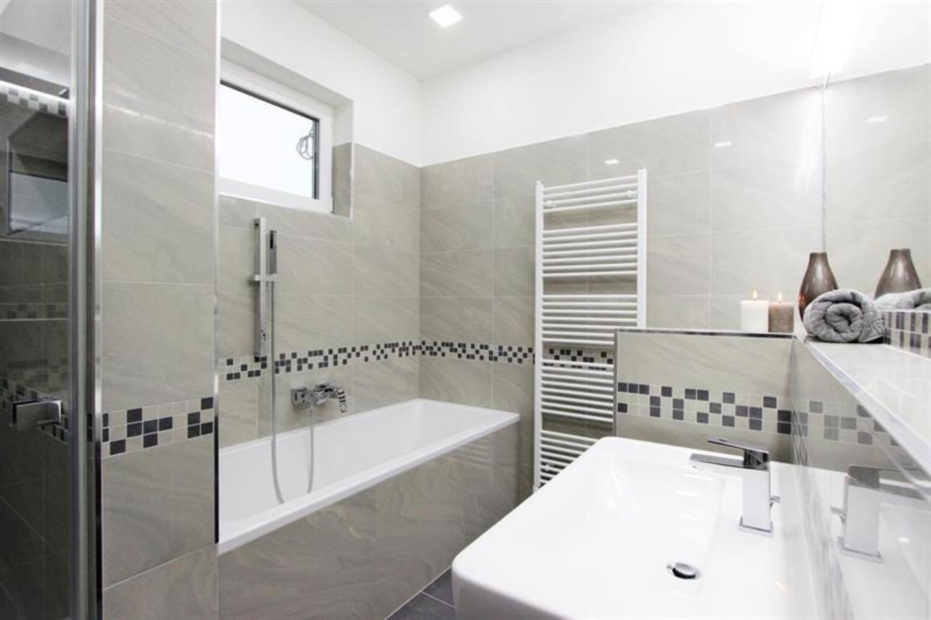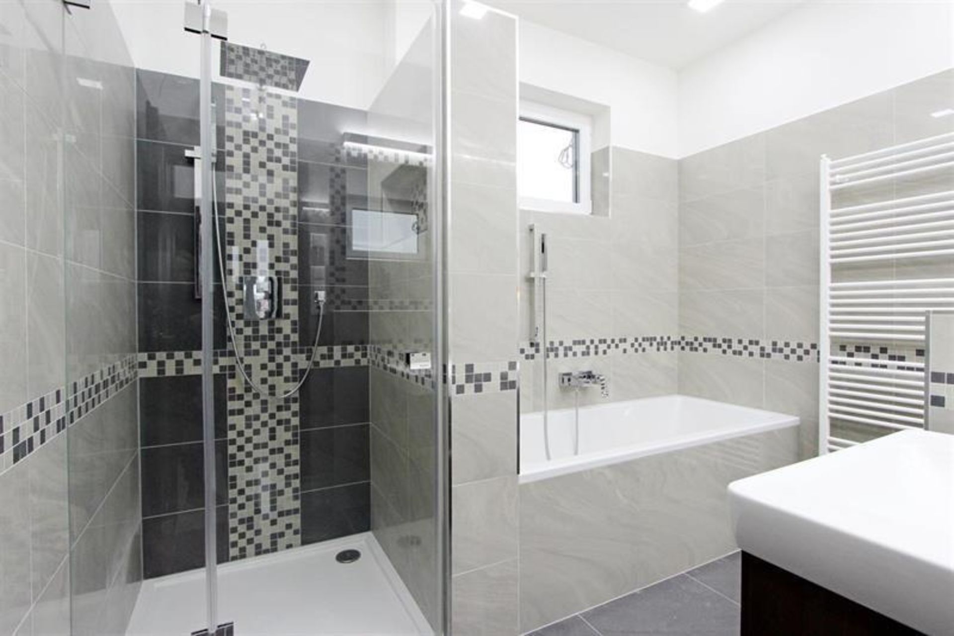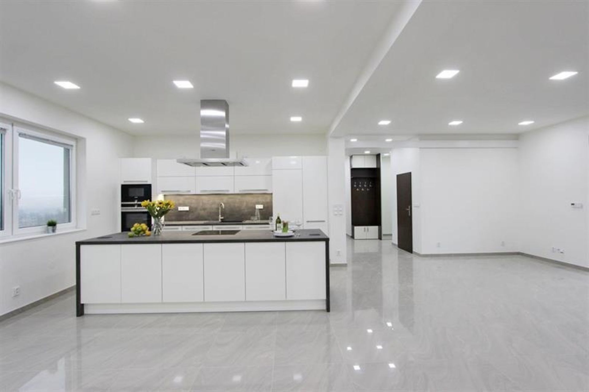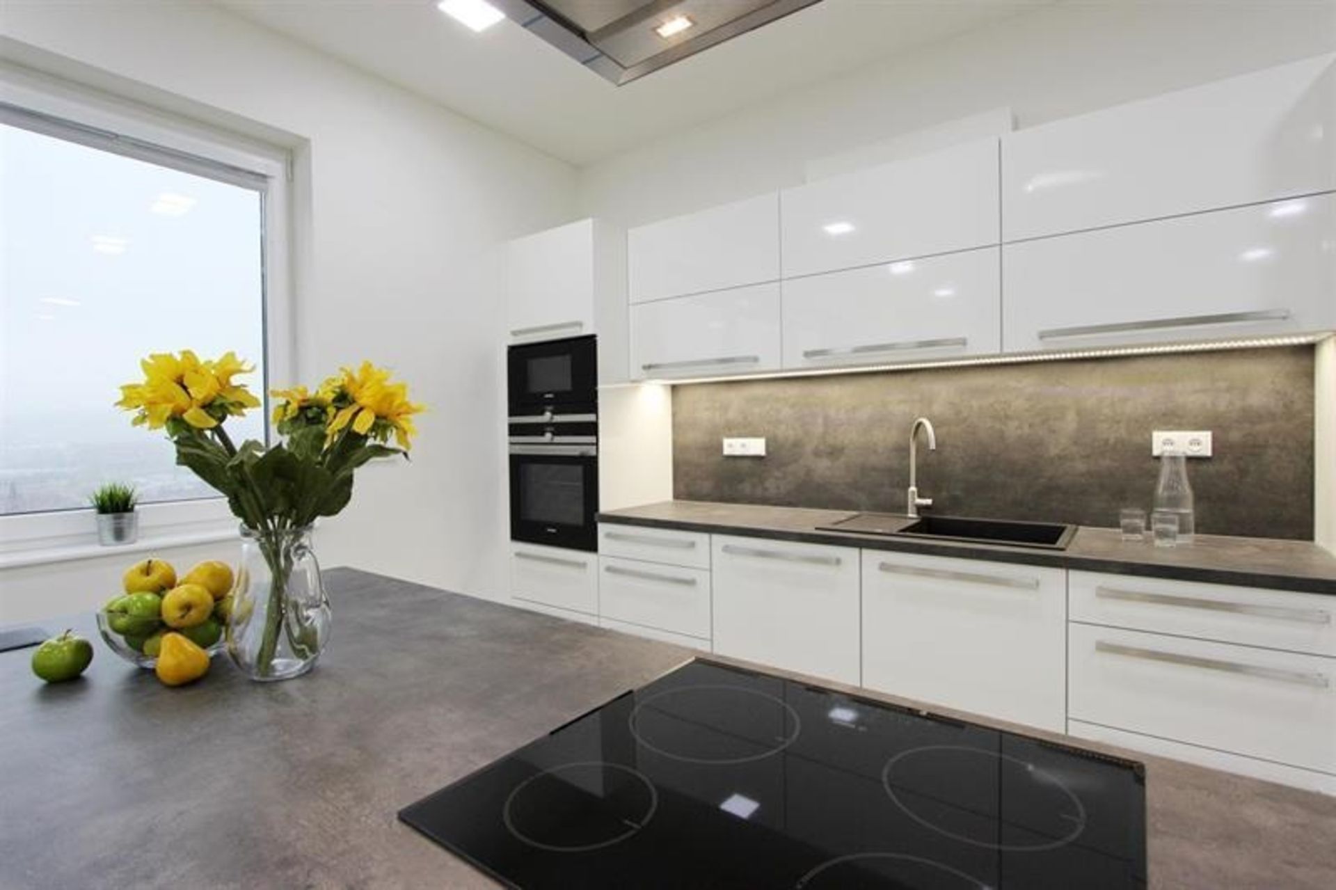 Moderní bílá kuchyňská linka s antracitovou pracovní deskou je vybavená veškerými vestavnými spotřebiči - sklokeramická varná deska, horkovzdušná trouba, mikrovlnná trouba, digestoř, myčka nádobí, lednice a mraznička.