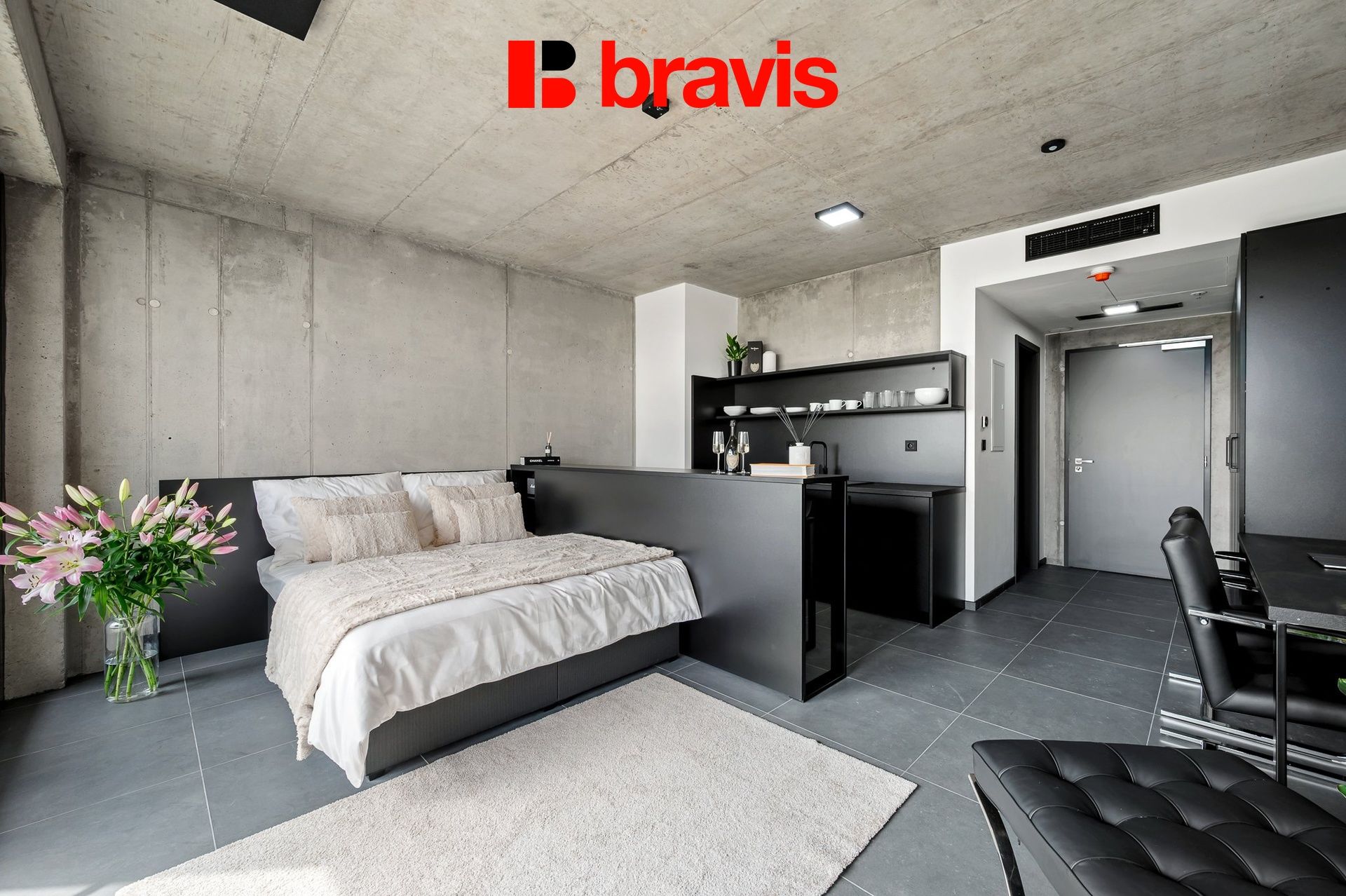 • Obytná část: Dominantou prostoru je ikonické křeslo Barcelona, doplněné o pohodlnou postel (160x200 cm) včetně lůžkovin. Pro vaši práci i relaxaci je připraven pracovní stůl, šatní skříně s velkým úložným prostorem a barový pult pro ranní kávu.