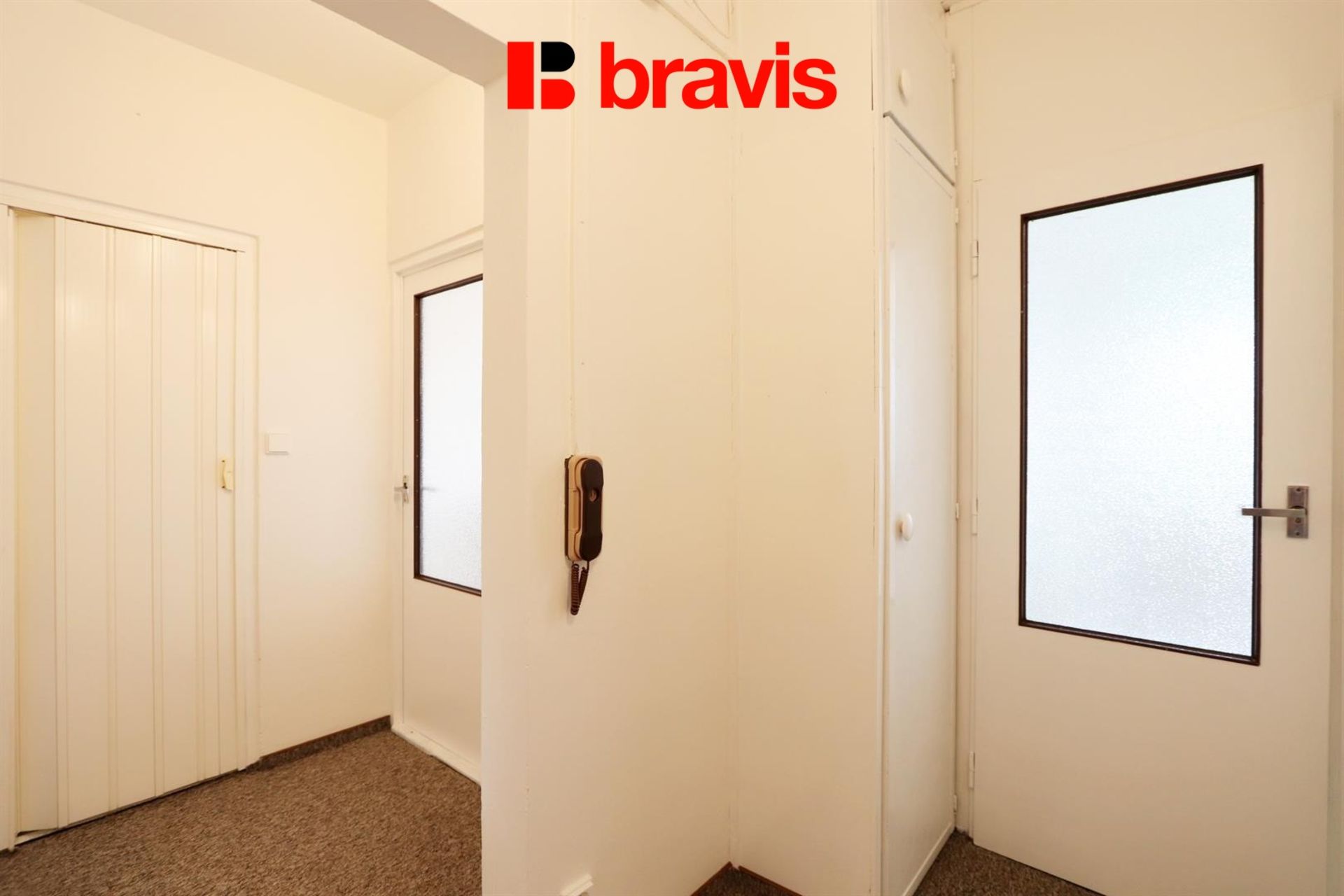 V předsíni je vestavěná skříň s policemi, zrcadlo a intercom.