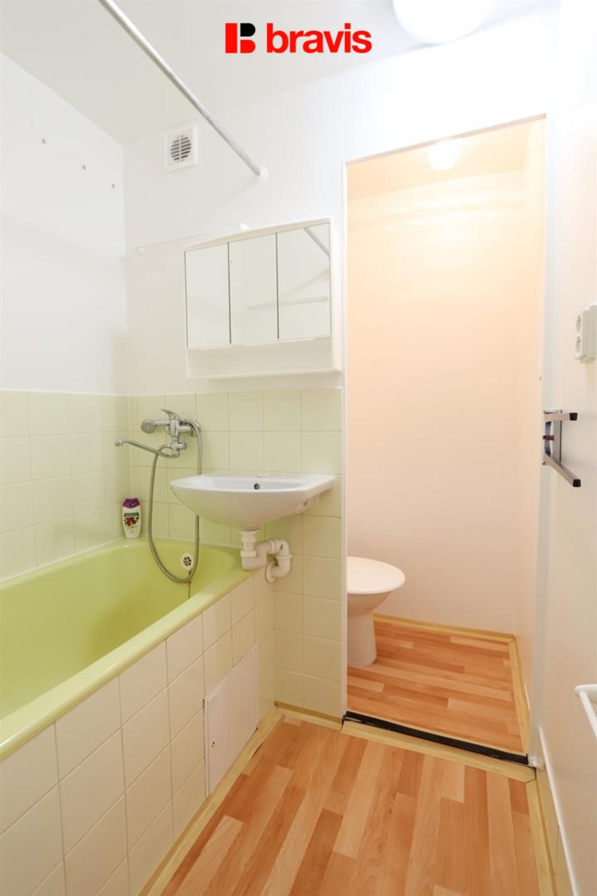 V koupelně je menší vana, umyvadlo se skříňkou a toaleta.