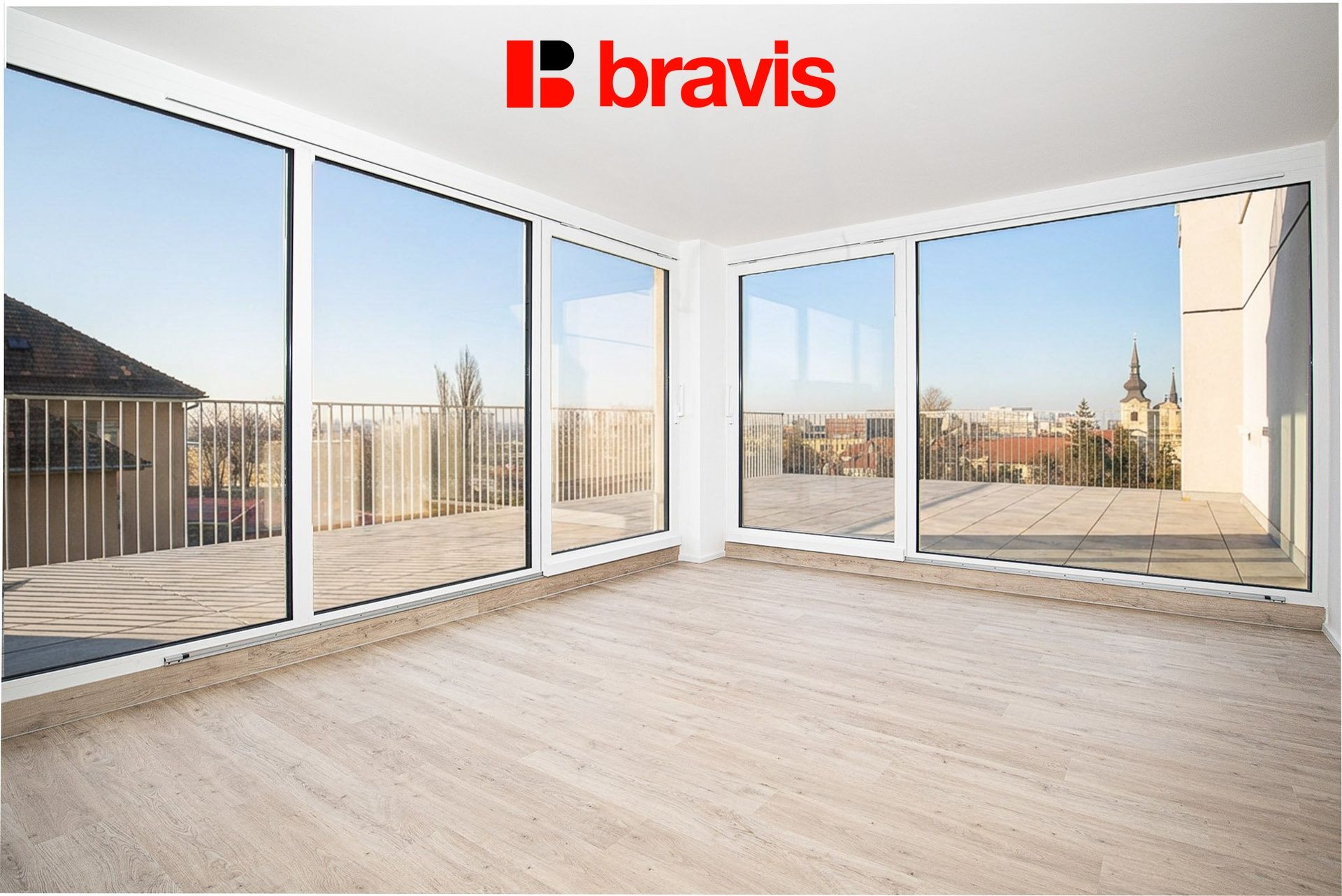 Byt je umístěn v 7. nadzemním podlaží novostavby s výtahem a díky velkým proskleným plochám je velmi světlý a vzdušný.