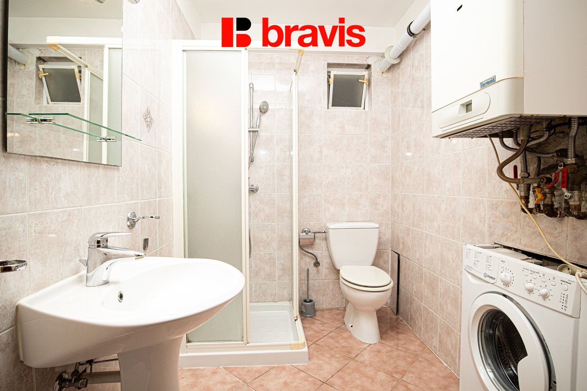 Koupelna je vybavena sprchovým koutem, toaletou a pračkou – vše, co potřebujete pro pohodlný život.