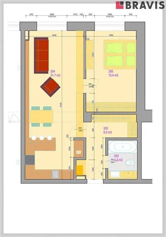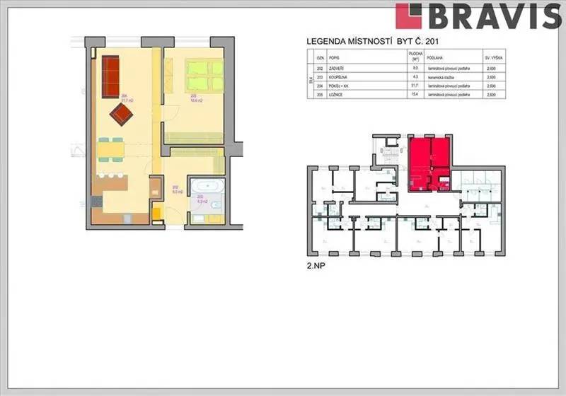 Byt 2+kk ozn. 201 o podlahové ploše 62,5 m2 a sklepem se nachází v 1. patře cihlového domu s výtahem.