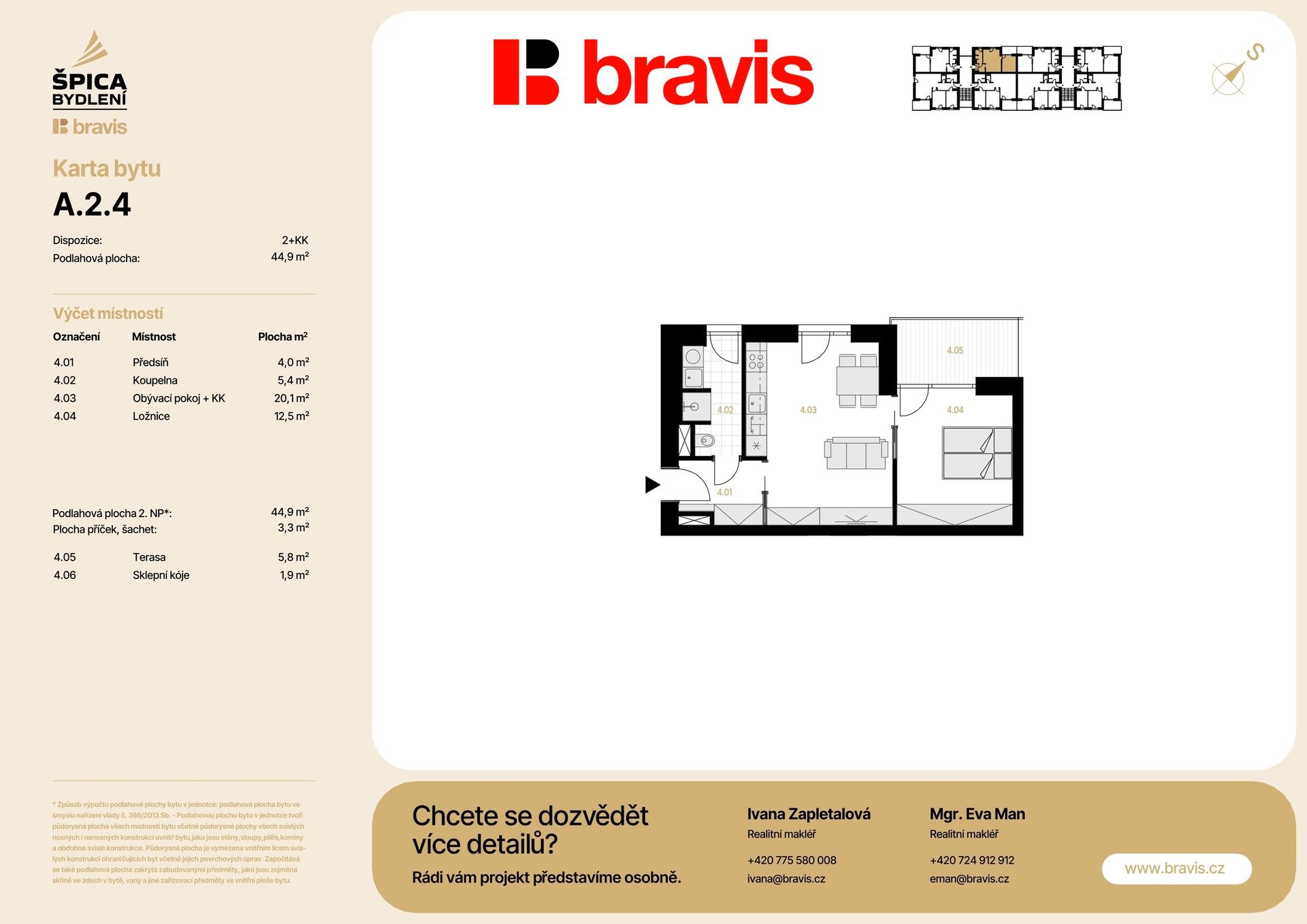 Nabízíme exkluzivní bytovou jednotku 2+kk (bytová jednotka A2-4) v novém projektu Špica bydlení — byt umístěný ve 2. NP nízkoenergetického bytového domu A. Celková podlahová plocha činí 44,9 m2, navíc k ní náleží terasa 5,8 m2, sklep a vlastní parkovací stání, což zajišťuje maximální komfort bez nutnosti dalších investic.