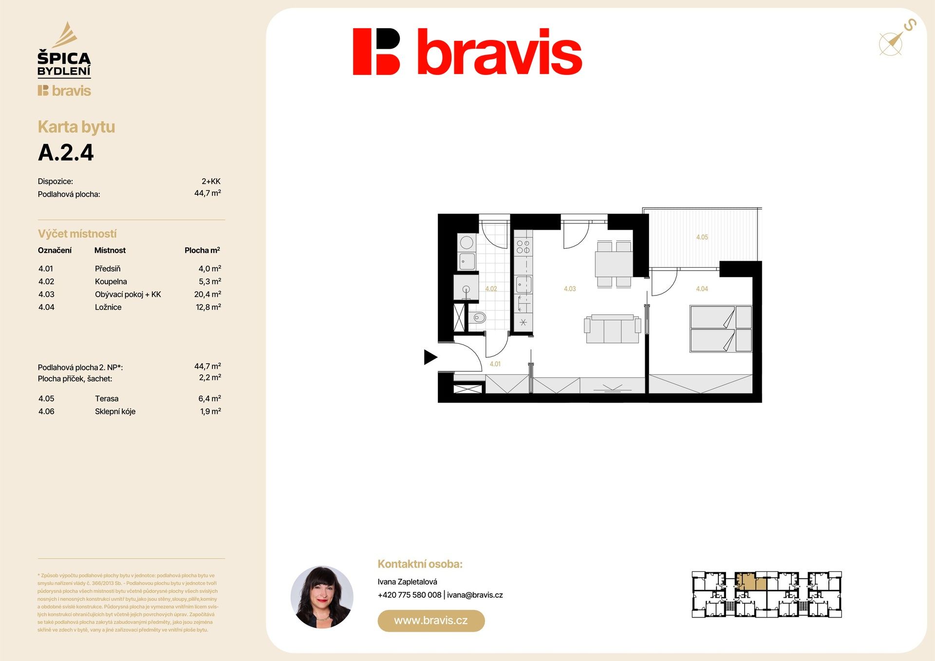 Nabízíme exkluzivní bytovou jednotku 2+kk (bytová jednotka A2-4) v novém projektu Špica bydlení — byt umístěný ve 2. NP nízkoenergetického bytového domu A. Celková podlahová plocha činí 44,7 m2, navíc k ní náleží terasa 6,4 m2, sklep a vlastní parkovací stání, což zajišťuje maximální komfort bez nutnosti dalších investic.