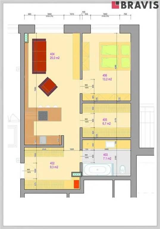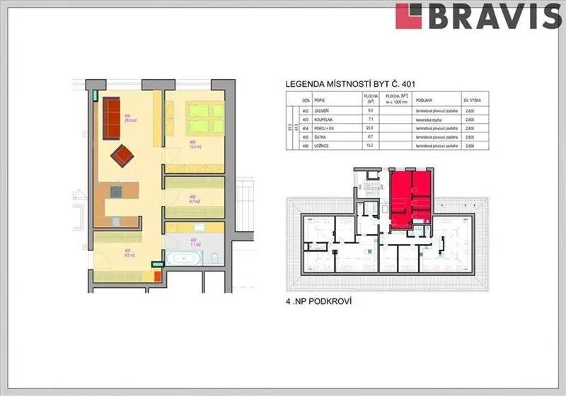 Byt 2+kk ozn. 401 o podlahové ploše 64,3 m2 se nachází ve 3. patře cihlového domu s výtahem.