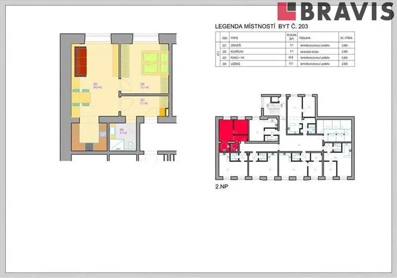 Byt 2+kk ozn. 203 o podlahové ploše 50,6 m2 a sklepem se nachází v 1. patře cihlového domu s výtahem.