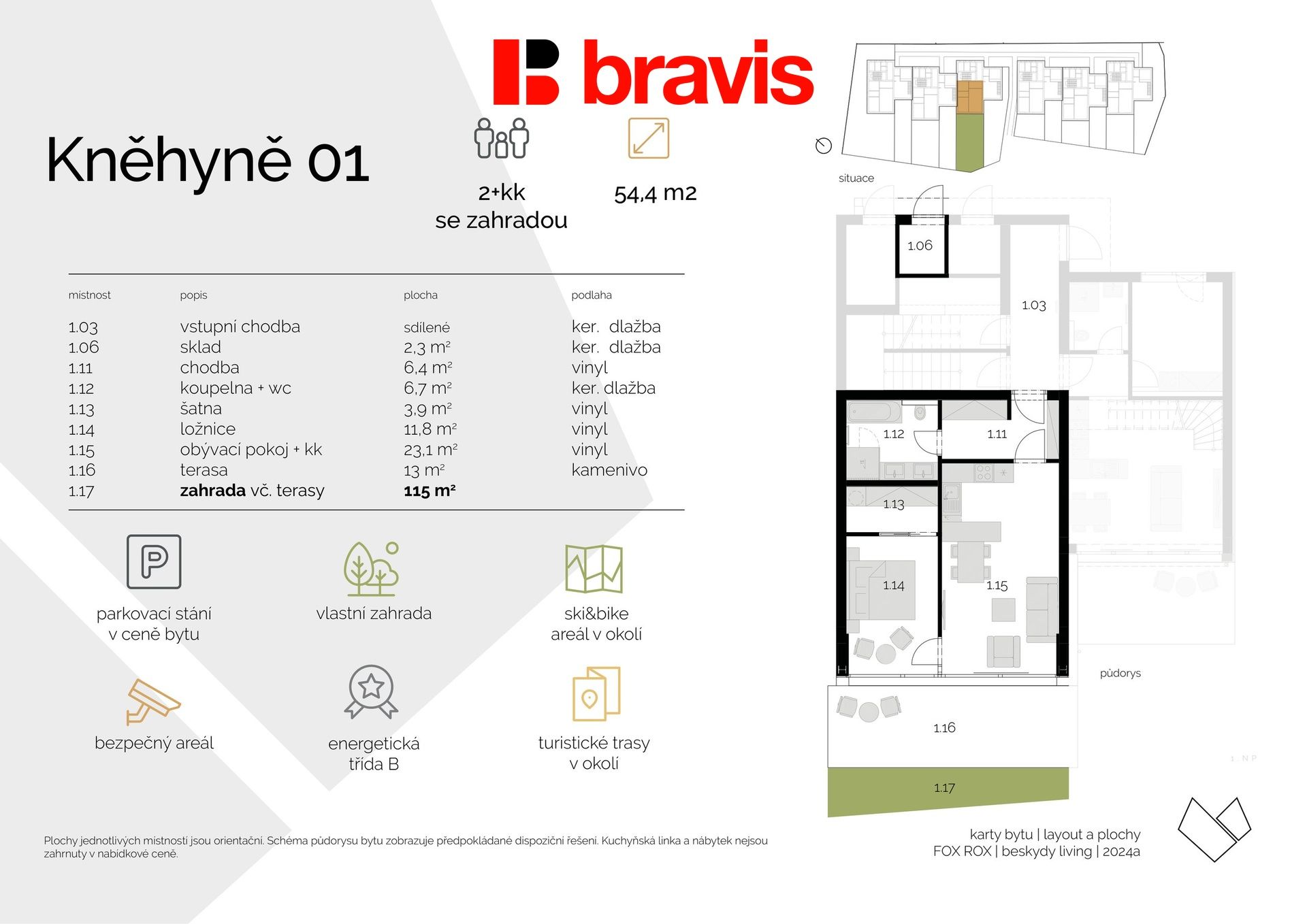 Prodej bytu 2+kk se zahradou v srdci Beskyd – Ostravice, projekt FOX ROX, parkování, sklad