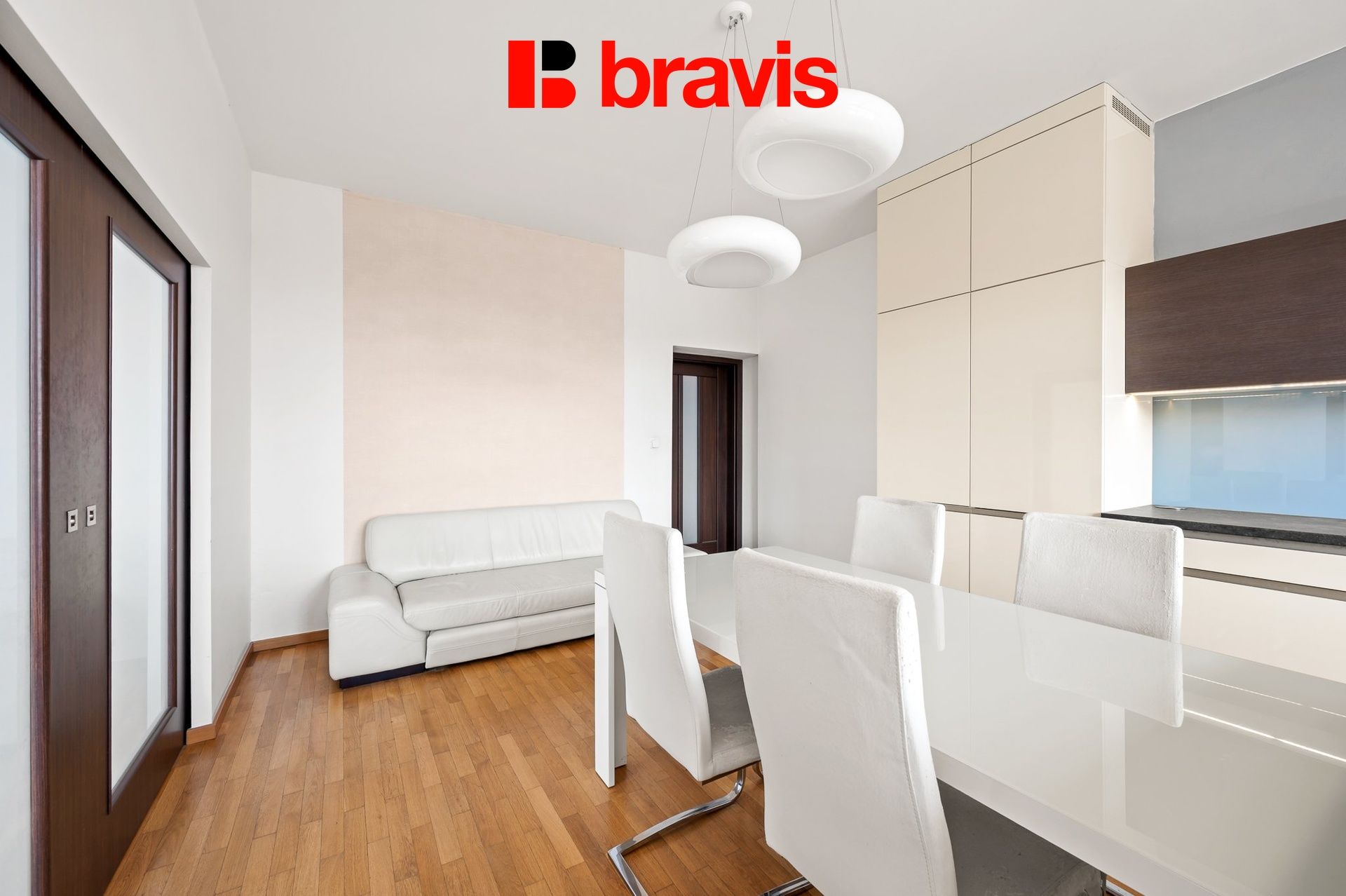 Dominantou bytu je útulný obývací pokoj s krbem a vstupem na balkon, který vytváří ideální prostor pro relaxaci i společné chvíle. Samostatná kuchyně je vybavena kuchyňskou linkou na míru včetně vestavěných spotřebičů (indukční varná deska, elektrická trouba, myčka a kombinovaná lednice) a doplněna jídelním koutem s designovým osvětlením.