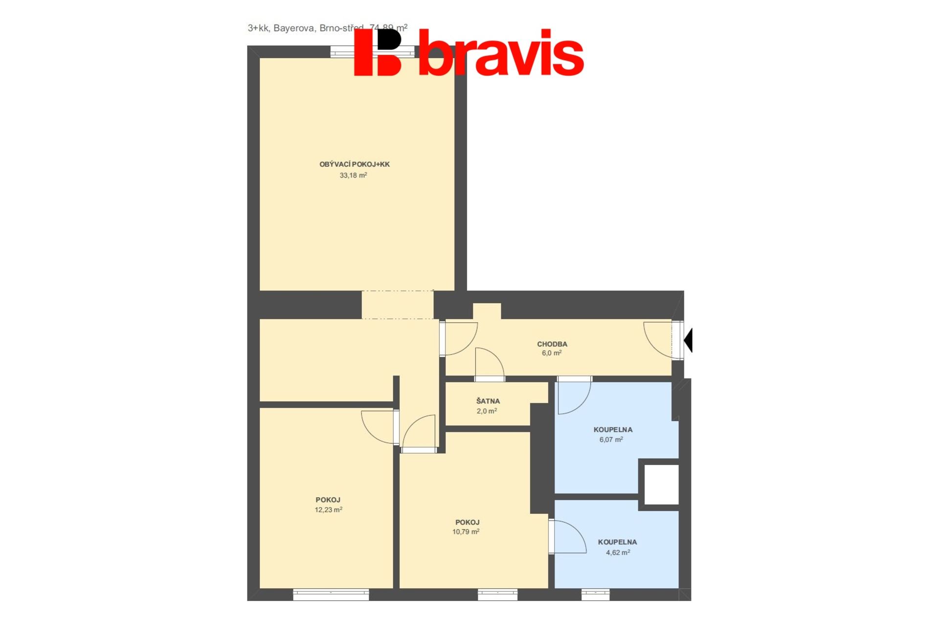 Prodej bytu 3+kk, 75 m2, Brno - střed, ulice Bayerova, 2 koupelny, šatna, blízko centra s výbornou dostupností