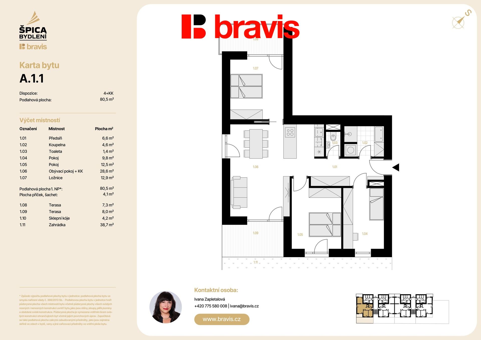Nabízíme exkluzivní bytovou jednotku 4+kk (bytová jednotka A1-1) v novém projektu Špica bydlení — byt umístěný v přízemí nízkoenergetického bytového domu A. Celková podlahová plocha 80,5 m2 s terasou 16,7 m2, zahrádkou 38,7 m2, sklepem 4,2 m2 a vlastní parkovací stání, to vše v ceně bytu.