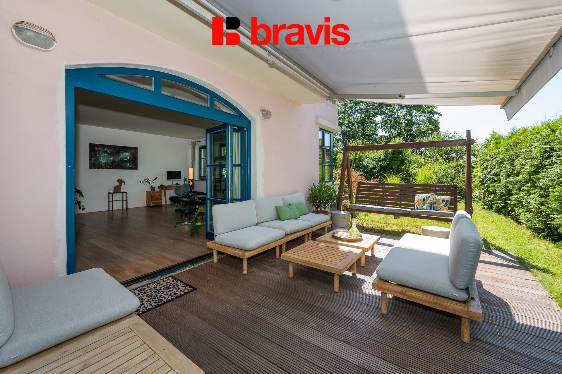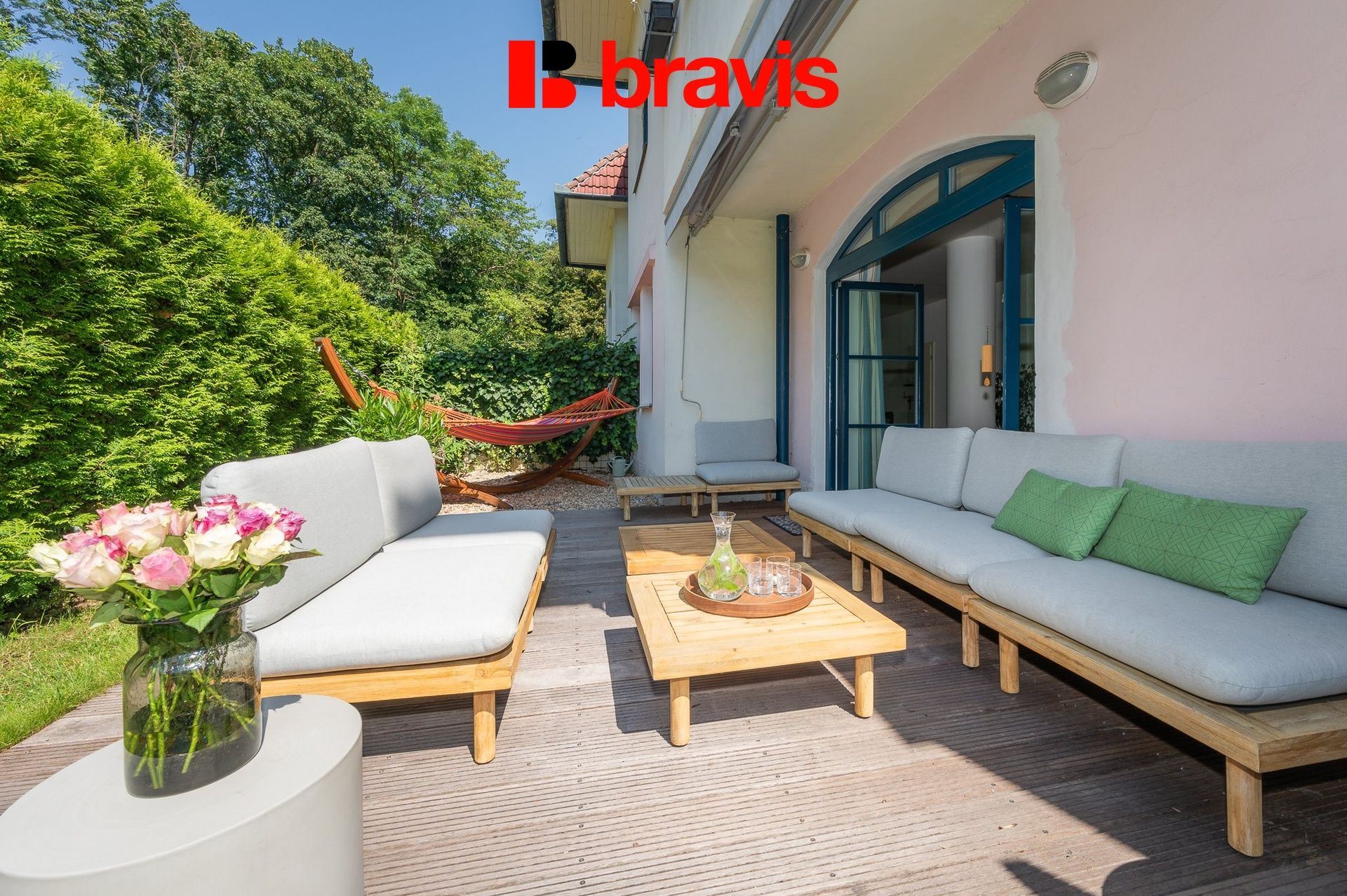 Byt se nachází v přízemí domu s pouze 6ti bytovými jednotkami, má přímý vstup na terasu (17 m2) a z ní na okrasnou zahradu k soukromému užívání (cca 160 m2).