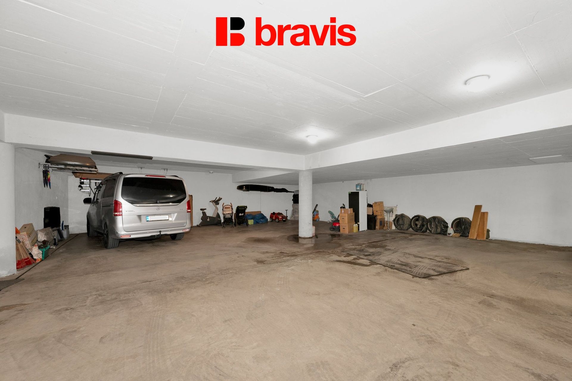 V podzemí domu je společná garáž, kde současní majitelé parkují dvěma vozidly.