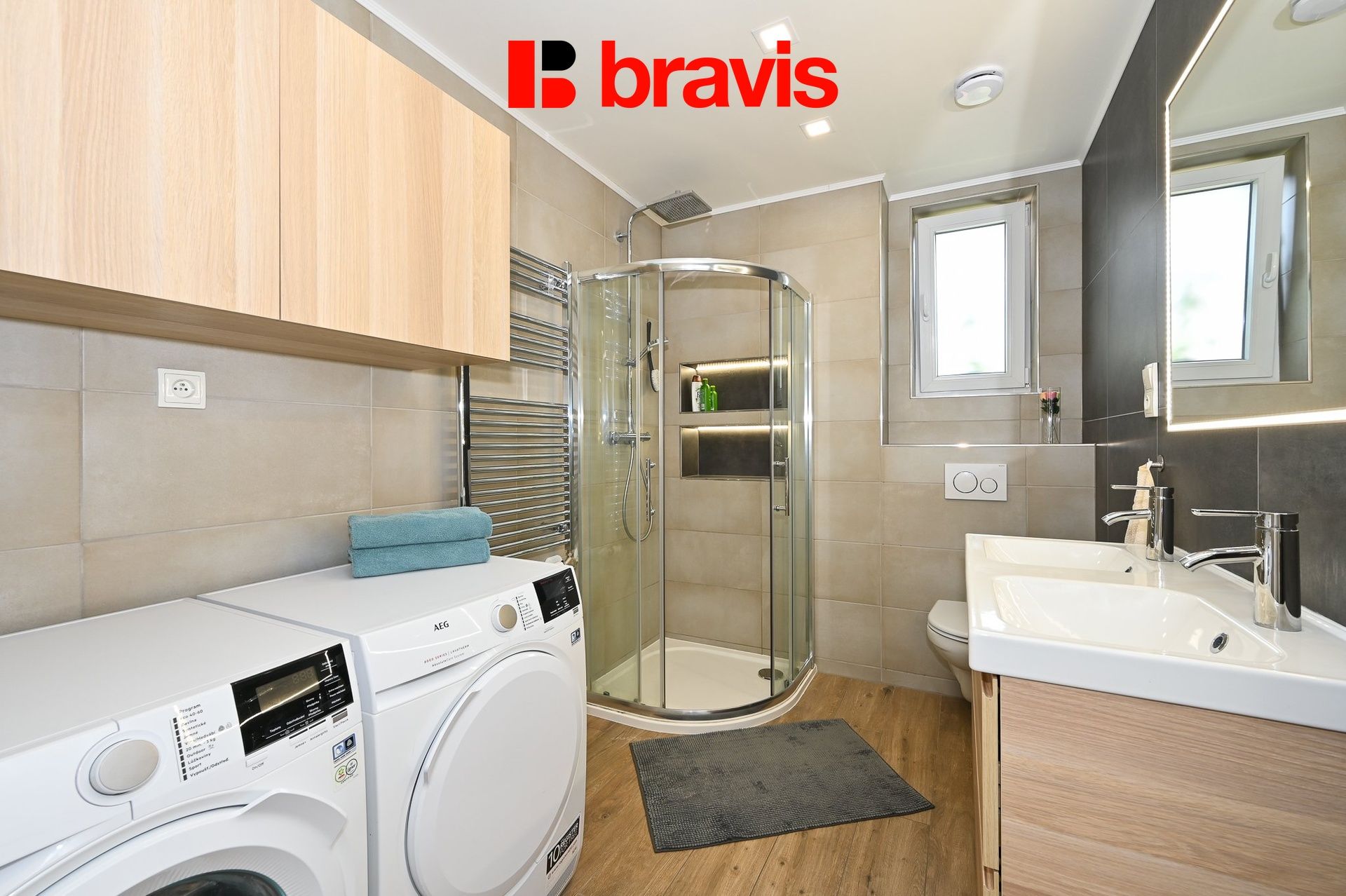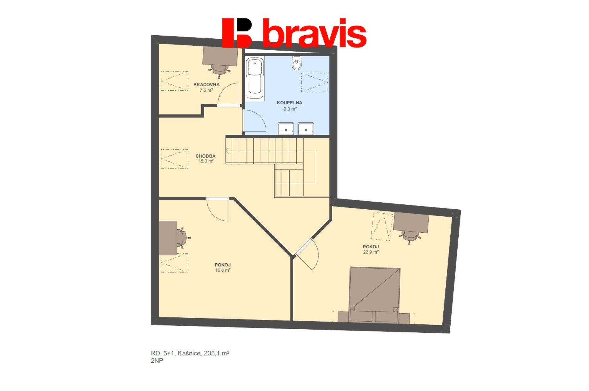 Dům s celkovou užitnou plochou 235 m2  nabízí promyšlené rozložení místností: v přízemí se nachází samostatná kuchyně, prostorný obývací pokoj a ložnice, na níž navazuje šatna s koupelnou a sprchovým koutem. V prvním patře naleznete tři velké pokoje a druhou koupelnu s vanou. Tento dům je ideální pro větší rodinu i pro ty, kdo ocení dostatek prostoru pro práci z domova, relaxaci i společné chvíle.