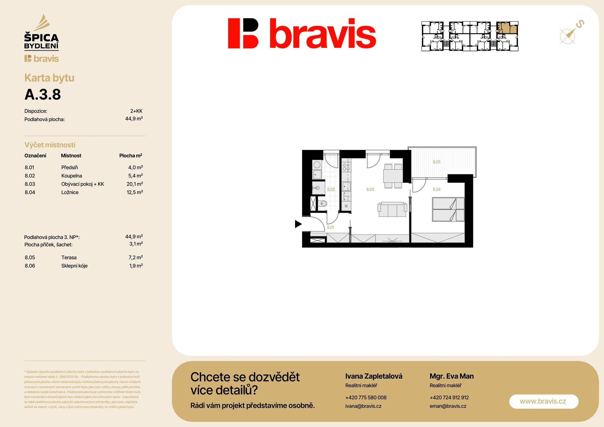 Byt (A3.8) se nachází ve 3. nadzemním podlaží nízkoenergetického bytového domu A a nabízí užitnou plochu 53,8 m2, která je promyšleně rozdělena do funkčních prostor: