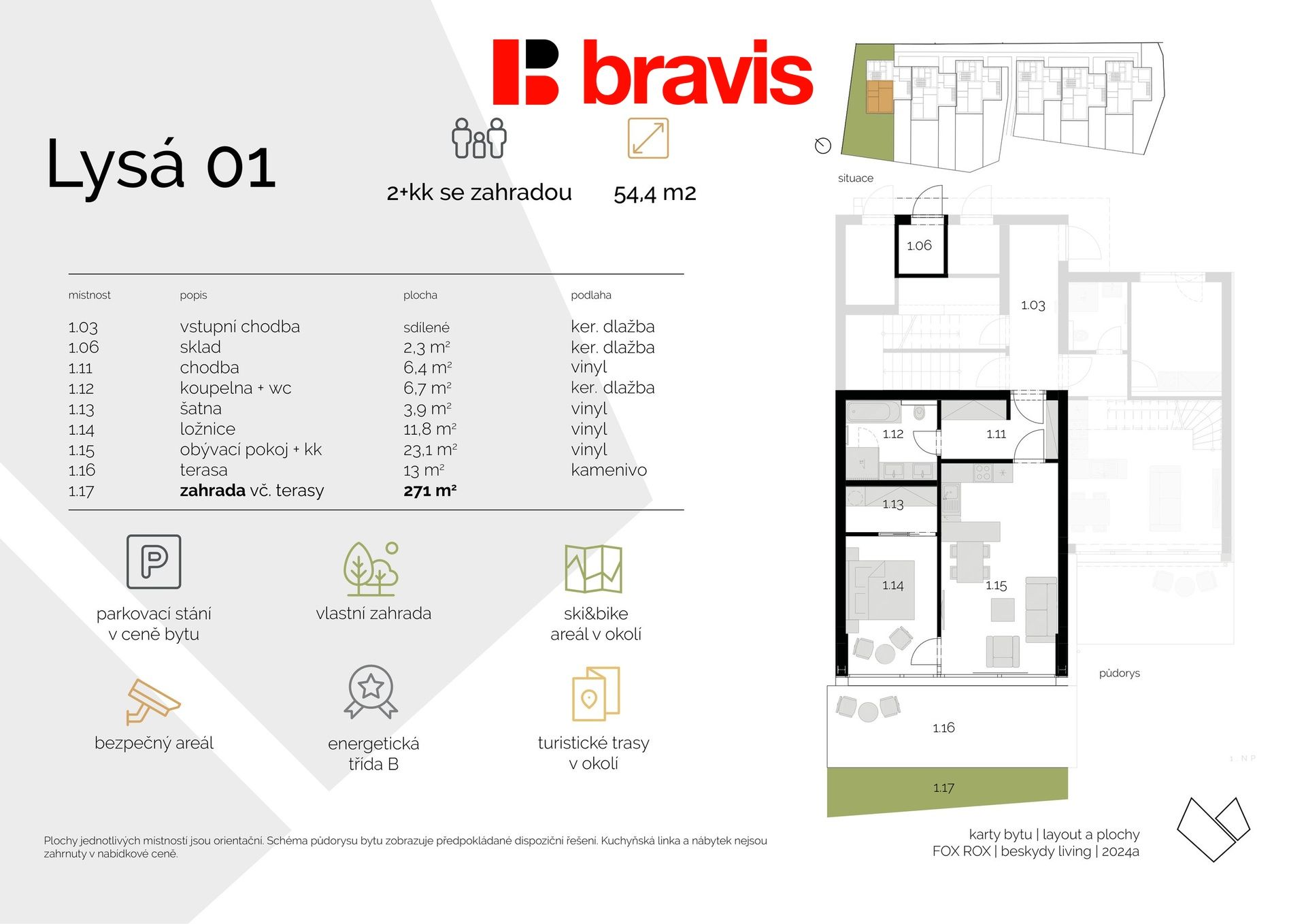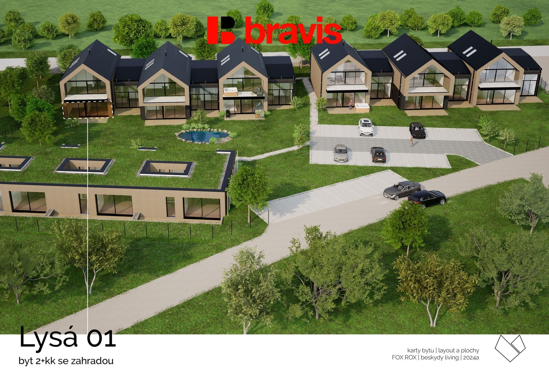 Prodej moderního bytu 2+kk se zahradou v srdci Beskyd – Ostravice, projekt FOX ROX, parkování, sklad