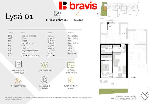 Byt má dispozici 2+kk a celkovou podlahovou plochu 54,4 m². Součástí bytu je také prostorná zahrada o celkové výměře 271 m², jejíž součástí je terasa o velikosti 13 m². Ta nabízí dostatek místa pro relaxaci, posezení i příjemné trávení volného času na čerstvém vzduchu.